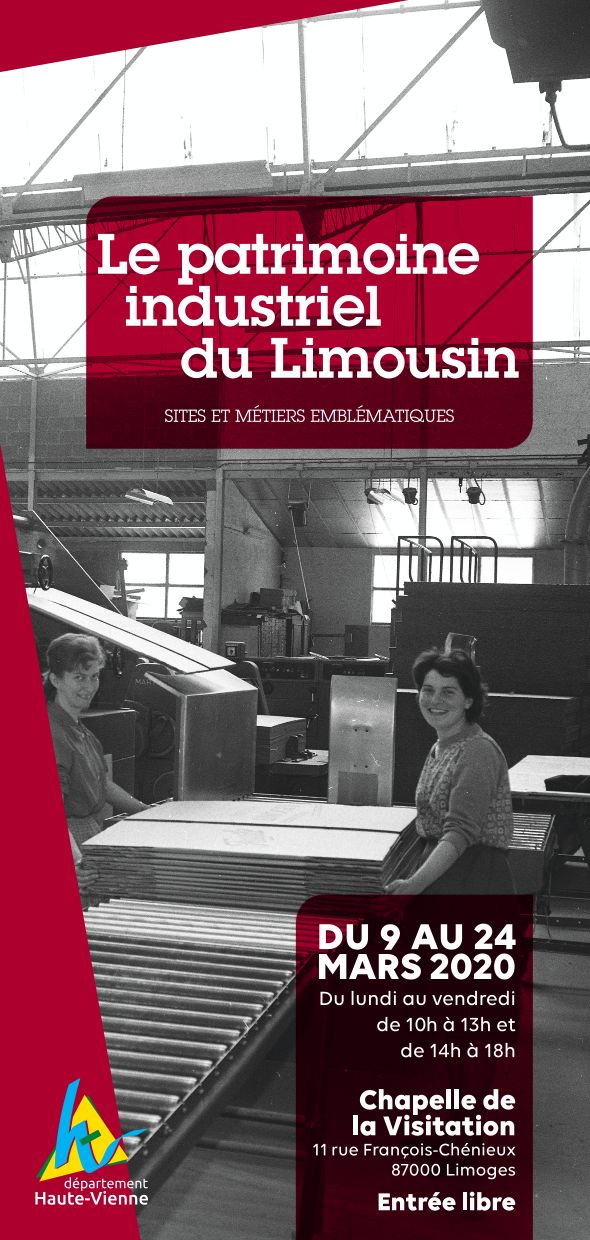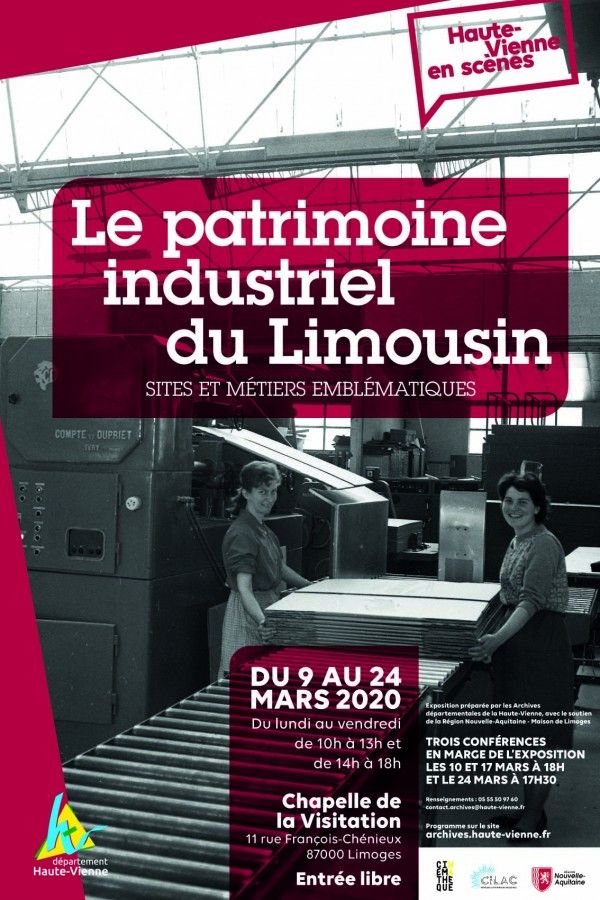 Du 9 au 24 mars 2020, les Archives départementales vous convient à la Chapelle de la Visitation pour la présentation d'une exposition réalisée par le Service Patrimoine et Inventaire de la Région Nouvelle-Aquitaine – Site de Limoges en collaboration avec des acteurs de terrain. Elle propose un panorama des activités emblématiques et des lieux de mémoire du patrimoine industriel en Limousin et fait suite à la publication du numéro spécial "Patrimoine industriel du Limousin" publié par la revue du CILAC, Patrimoine industriel, n° 71, déc. 2017 (www.cilac.com).