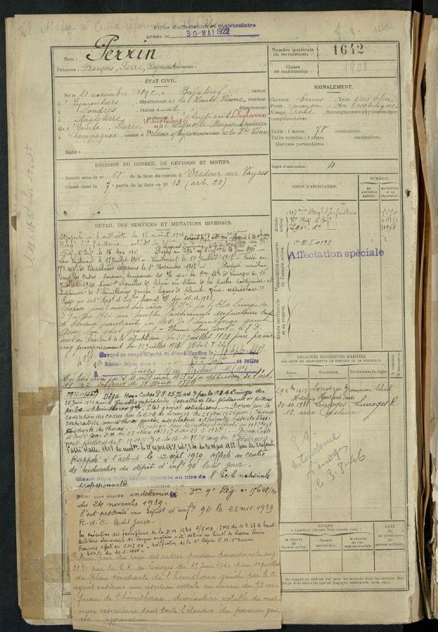 Vous pourrez ainsi retrouver aisément les fiches matricules de certaines personnalités locales nées dans cette période comme Michel BERNARDAUD et Jacques BERNARDAUD, Léon BETOULLE, Frank BURTY-HAVILAND, Georges DUMAS, Armand DUTREIX, Joseph GUILLEMOT, Georges HAVILAND ou encore François PERRIN.