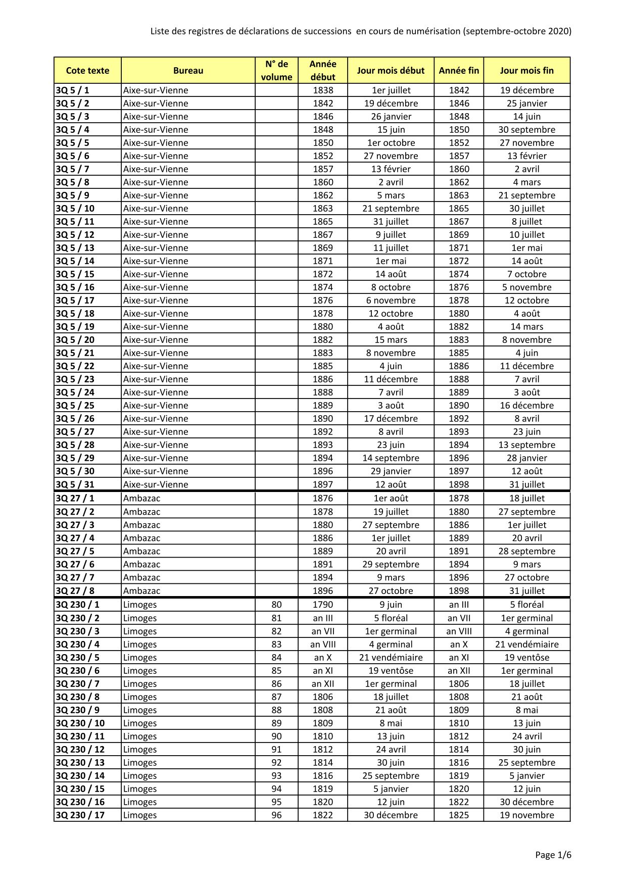 Après les opérations de numérisation du premier semestre 2020, c'est au tour de certains registres de déclarations de successions des bureaux de partir en numérisation. Il s'agit des registres antérieurs au 31 juillet 1898 pour les bureaux suivants :