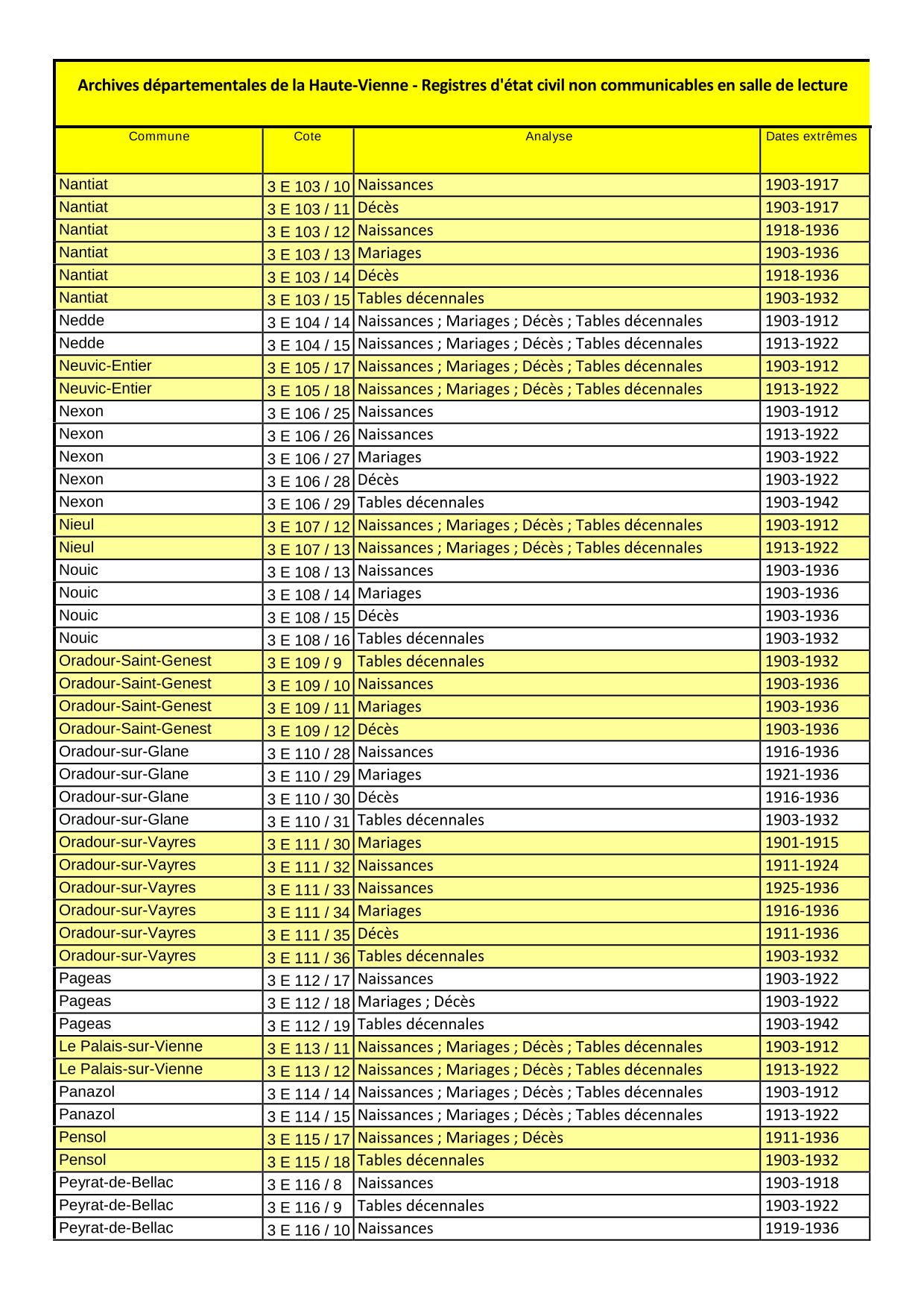 Les Archives départementales de la Haute-Vienne poursuivent leur programme de numérisation de l'état civil. Une seconde tranche de registres concernant la période 1902-1936 (communes de Nantiat à Villefavard) sera de ce fait indisponible en salle de lecture à compter du jeudi 30 juin (liste détaillée consultable ci-dessous et en salle de lecture).