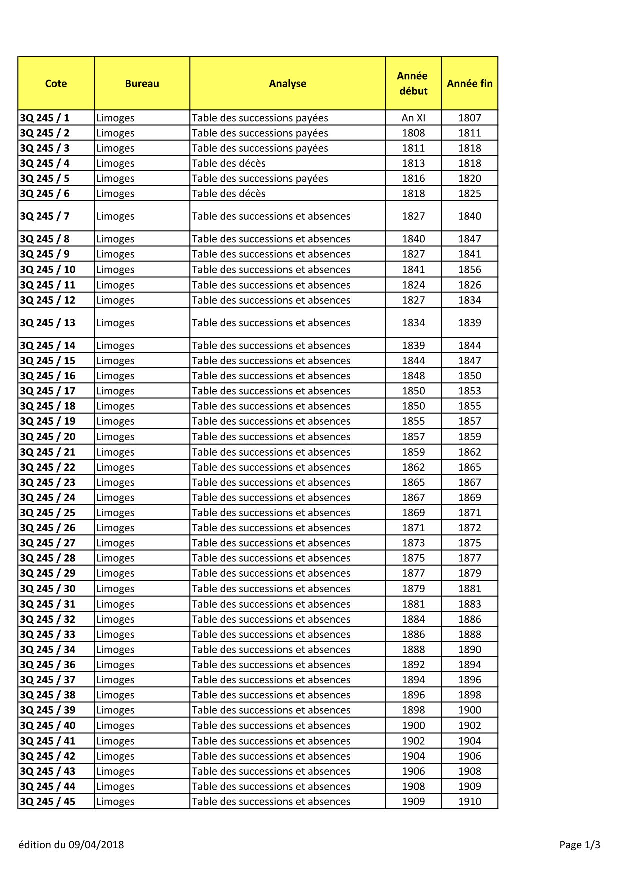 Après la numérisation par l'atelier des Archives départementales de la Haute-Vienne des listes nominatives des recensements de population (sous-série 6 M), une importante opération a été entamée en janvier 2018 pour numériser les tables de successions et absences (classées, selon les périodes, en sous-séries 3 Q ou W). Dans un premier temps, seront concernés les bureaux d'Aixe-sur-Vienne, Ambazac, Châlus, Laurière, Limoges et Pierre-Buffière.