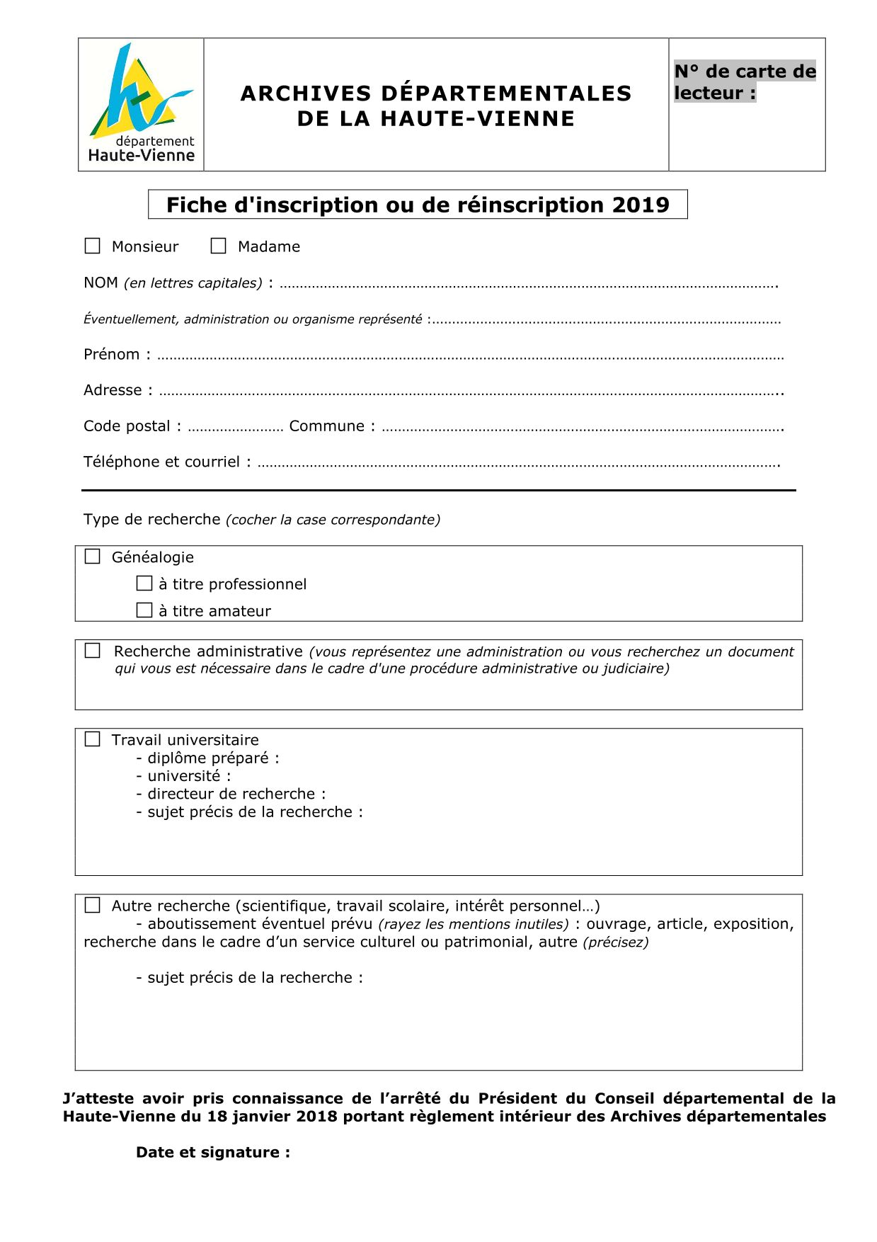 N'hésitez pas à préparer votre venue, en téléchargeant et en remplissant la fiche d'inscription 2019 ci-dessous. Vous pouvez nous l'envoyer par courrier électronique à l'adresse contact.archives@haute-vienne.fr .