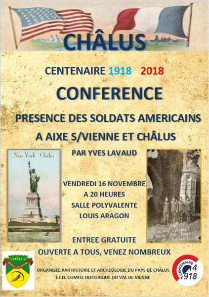 Une partie de l'exposition évoque la présence américaine en Haute-Vienne durant cette période. Ce sujet sera développé au cours d'une conférence "Présence des soldats américains à Aixe-sur-Vienne et Châlus" de M. Yves Lavaud le 16 novembre 2018 à 20 h à Châlus, salle polyvalente Louis Aragon. Entrée libre et gratuite, dans la limite des places disponibles.