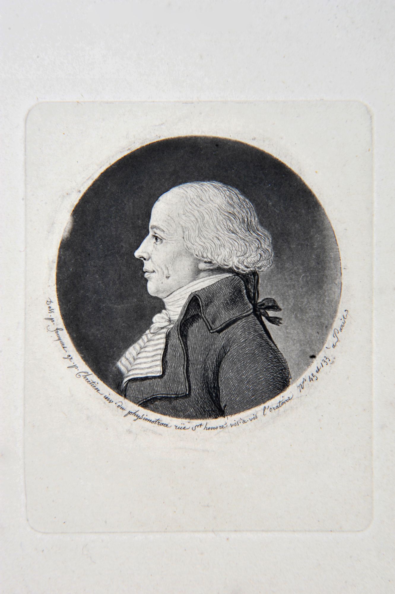 Portrait en médaillon au physionotrace, de Léonard Gay de Vernon né à Saint-Léonard de Noblat le 5 décembre 1748. Il est le fils ainé de Charles Gay de Vernon et frère de Simon François Gay de Vernon. Il fait ses études au séminaire d’Angers puis est nommé curé de Compreignac en 1785. Le 11 février 1790, il est élu maire de cette même commune et le reste durant 1 an. Le 14 février 1791 il est élu évêque constitutionnel de la Haute-Vienne, et démissionne le 21 février de son poste de maire. Il fut élu député à l’Assemblée législative, à la Convention nationale puis membre du Conseil des Cinq-Cents. Il décède le 28 octobre 1822 au Château de Vernon à Moissannes.