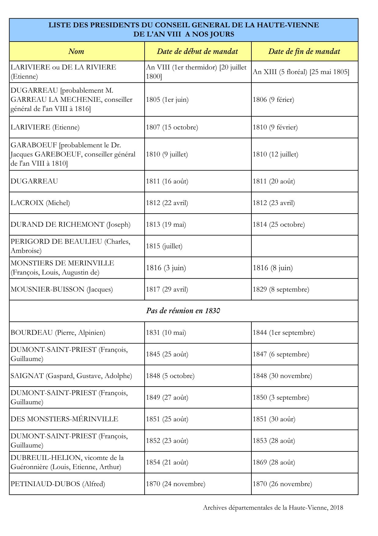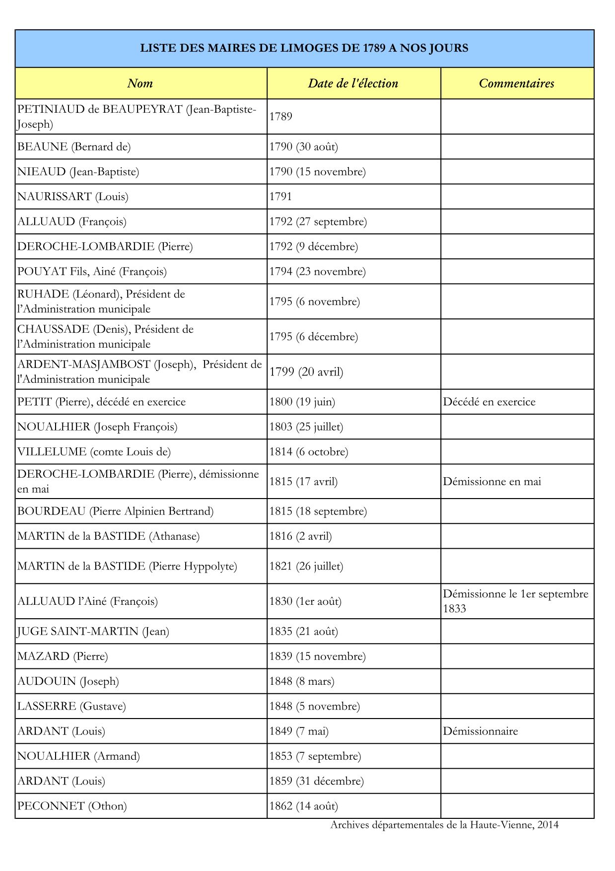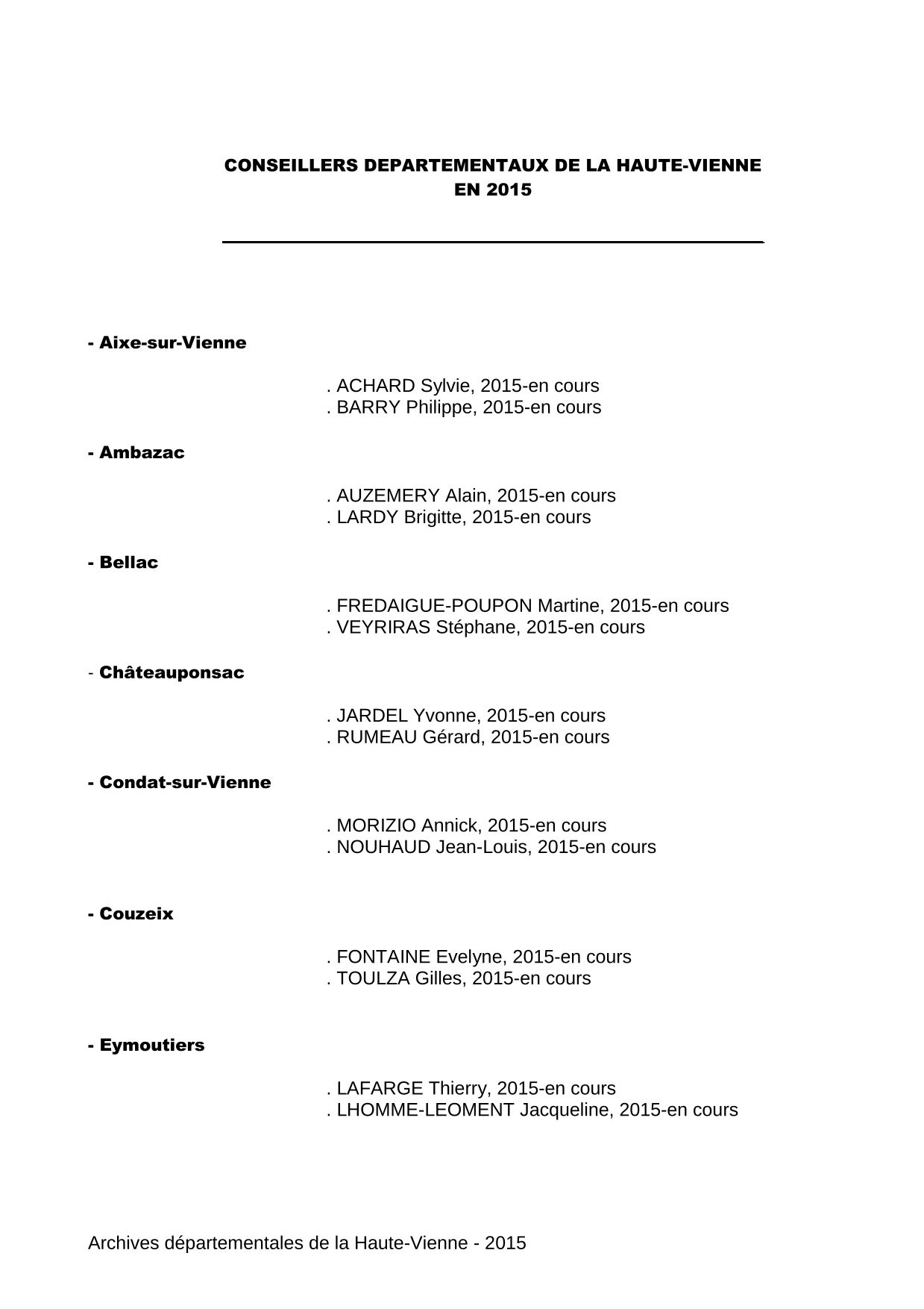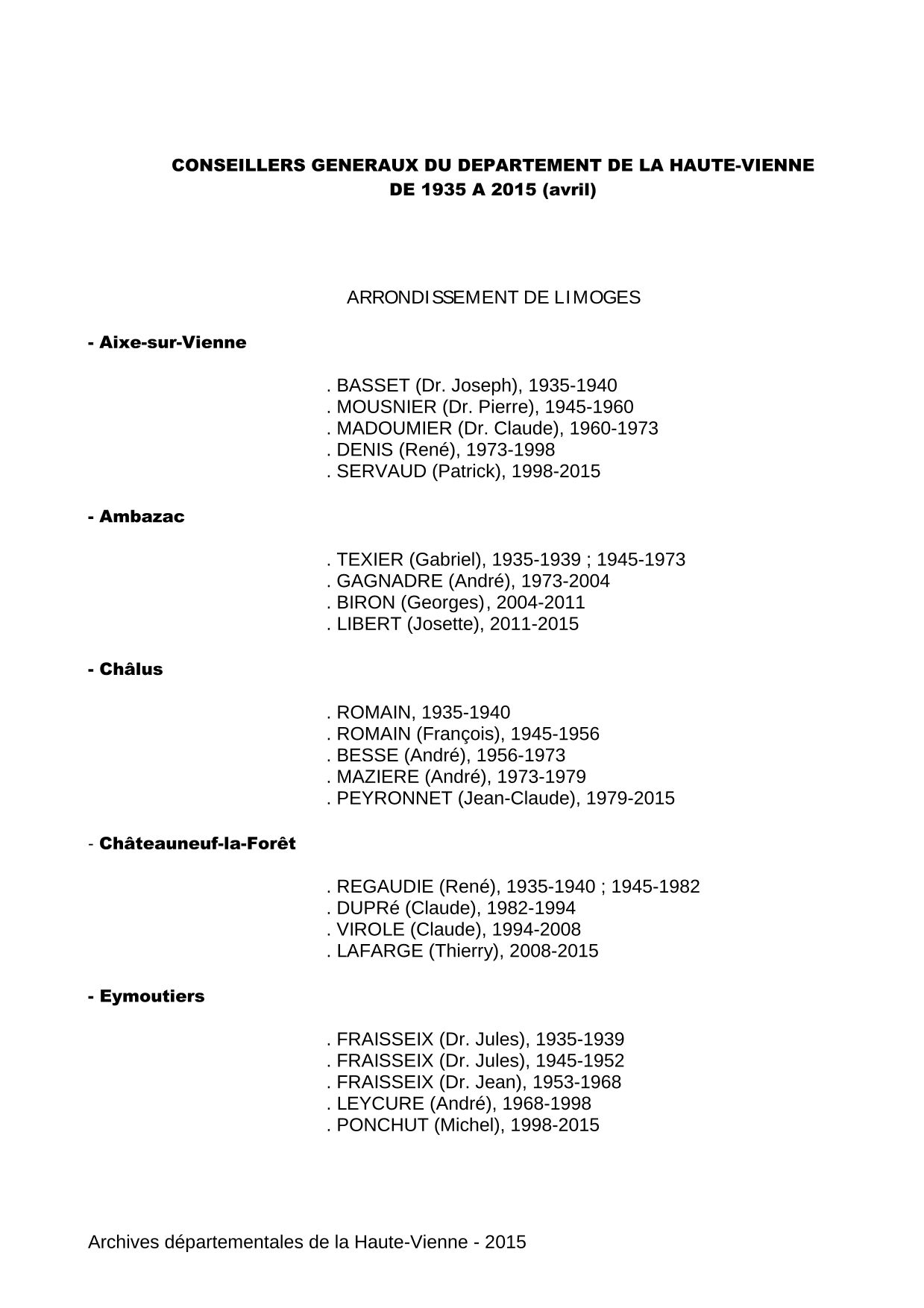 Des listes des élus haut-viennois (sénateurs, députés, présidents du Conseil général puis départemental, conseillers généraux et maires) sont consultables ci-dessous.