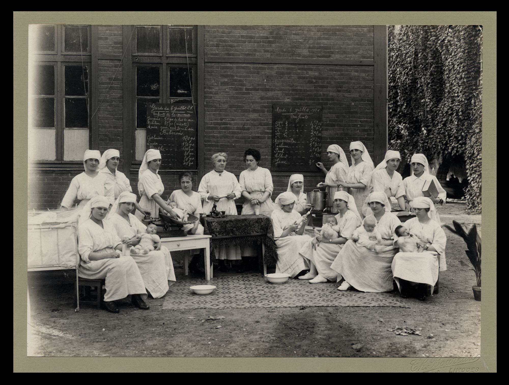 Réponse : Sur cette photo, on peut observer Marguerite Étienne (au milieu), maîtresse sage-femme et un groupe de sages-femmes. On notera la présence de deux tableaux récapitulatifs des pesées et des quantités de lait absorbé par les nourrissons. Marguerite Étienne a obtenu son diplôme de sage-femme 1ère classe le 24 juin 1895 à Paris. Elle officia en tant que maîtresse sage-femme à l’hôpital de Limoges du 20 mai 1894 au 1er mars 1928, au sein de la maternité, et à l’hôpital Beaupeyrat durant la guerre de 14/18.