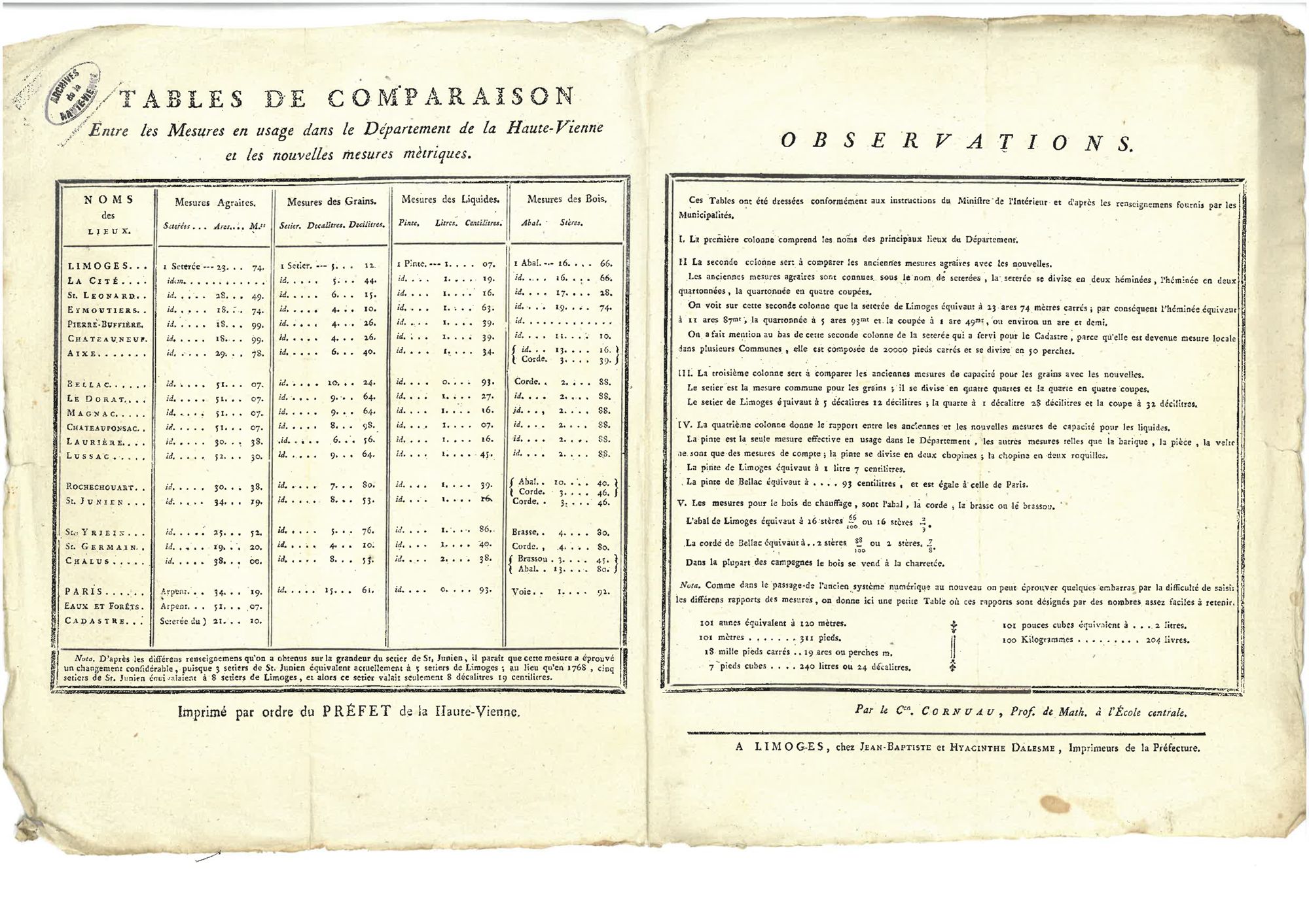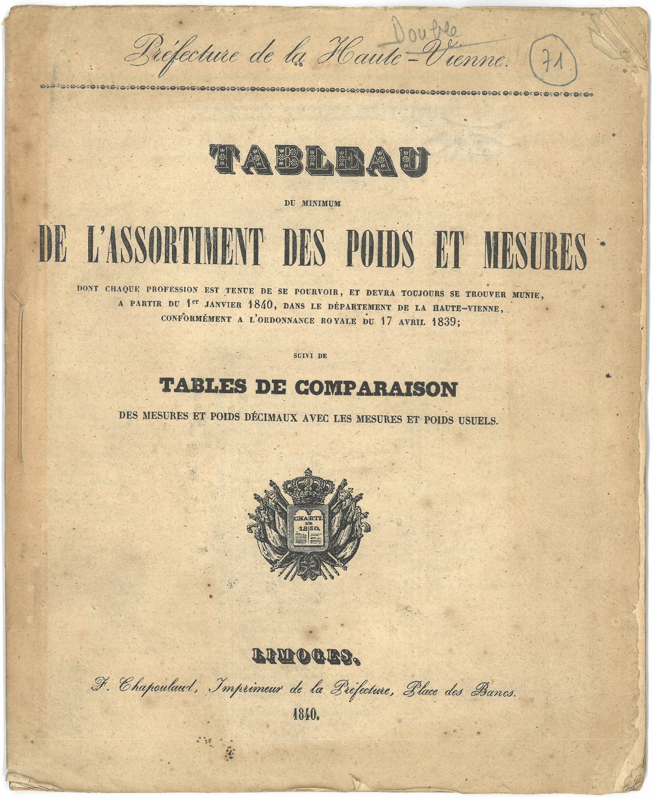 Les derniers tableaux, connus par plusieurs exemplaires (E dépôt 142 / G 5 et BR 3190 notamment), sont extraits d'un Tableau du minimum de l'assortiment des poids et mesures dont chaque profession est tenue de se pourvoir et devra toujours se trouver munie à partir du 1er janvier 1840, imprimé à Limoges en 1840. Ils indiquent les correspondances, dans les deux sens, entre les anciennes mesures utilisées à Limoges et les nouvelles mesures métriques pour :