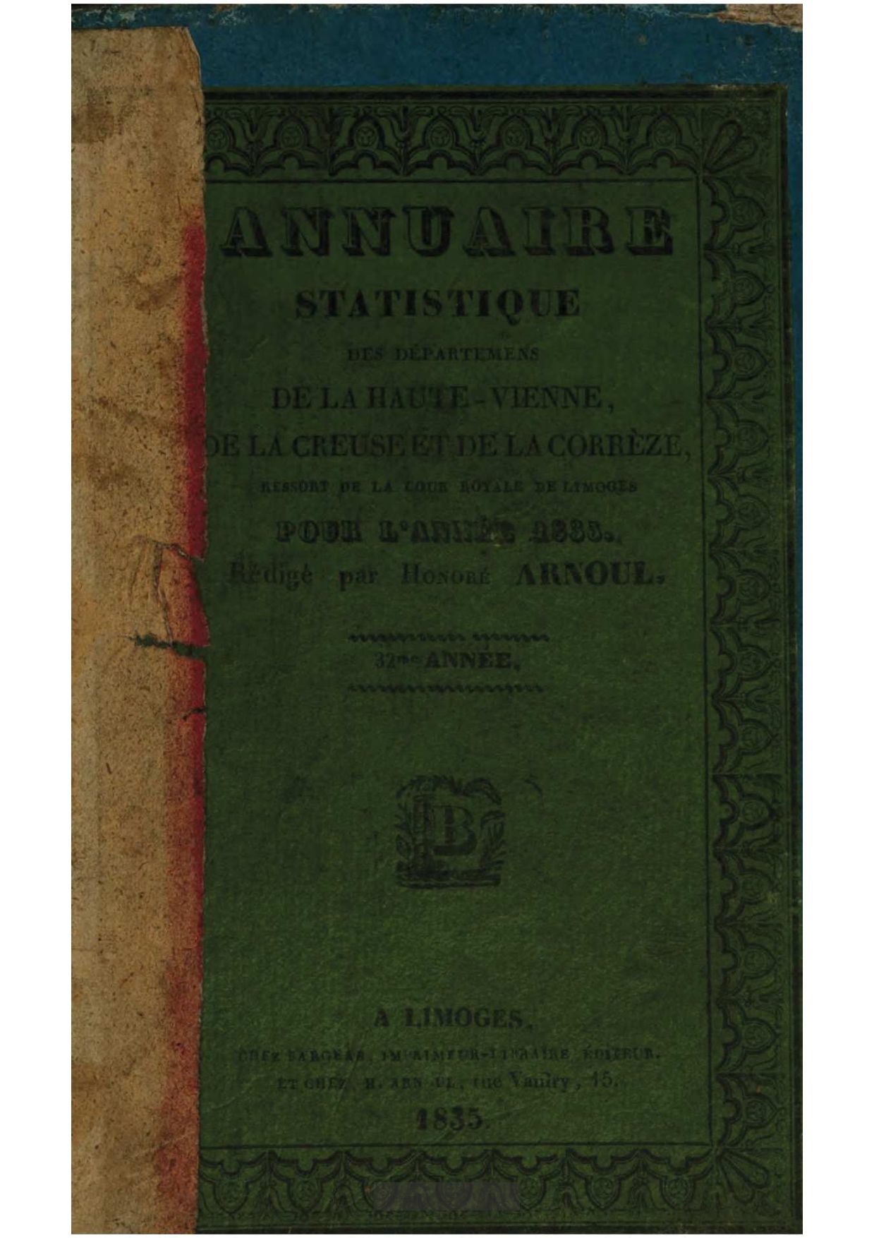 Les secondes sont extraites de l'Annuaire statistique des départemens de la Haute-Vienne, de la Creuse et de la Corrèze pour l'année 1835 rédigé par Honoré Arnoul (BIB I/L 104). Elles concernent également :