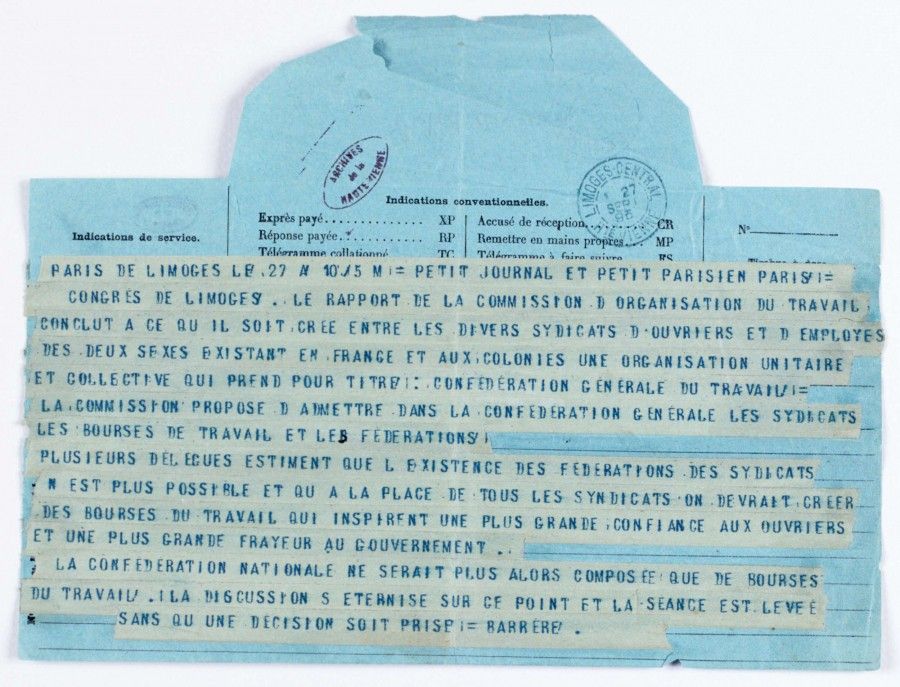 En 1893 est créée la Fédération ouvrière de Limoges et du Centre : se défendant de toute appartenance politique, elle se prononce contre l’idée de grève générale. C’est peut-être cette position assez neutre associée à l’image de « Limoges ville rouge » qui amena à y organiser, en septembre 1895, le VIIe congrès des chambres syndicales, groupes corporatifs, fédérations des métiers, unions et bourses du travail. Le vendredi 27 septembre, après des discussions longues et difficiles, une organisation unitaire est créée : la Confédération générale du travail.