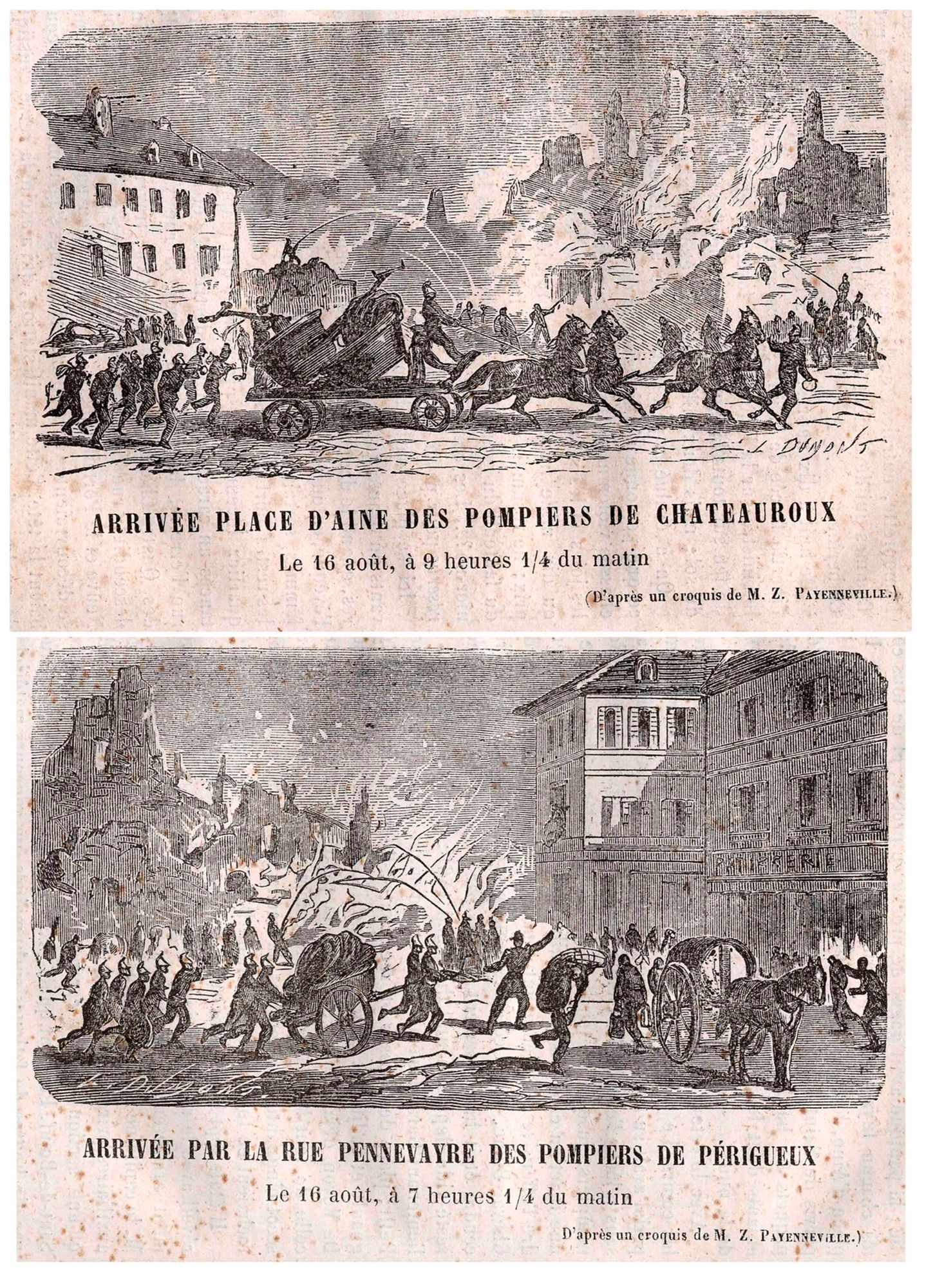 Ces mesures n’évitèrent pas de nouvelles catastrophes ; ainsi, de 1793 à 1864, on a recensé 815 incendies et 5631 feux de cheminées. La période se clôt par un des plus violents incendies de l’époque moderne et contemporaine, celui du 15 août 1864. Un lumignon mal éteint produisit l’embrasement de 109 maisons dans le quartier des Arènes et autour des places d’Aine et de la Motte, mettant à la rue plus de 2000 personnes. À cette occasion on relève à l’égard des secours les mêmes critiques qu’en 1790 : effectifs trop faibles (pourtant portés à 80 hommes en 1864) au point qu’on appela en renfort les Compagnies de Périgueux et de Châteauroux et insuffisance du matériel qui de surcroît ne semblait pas être entretenu régulièrement.