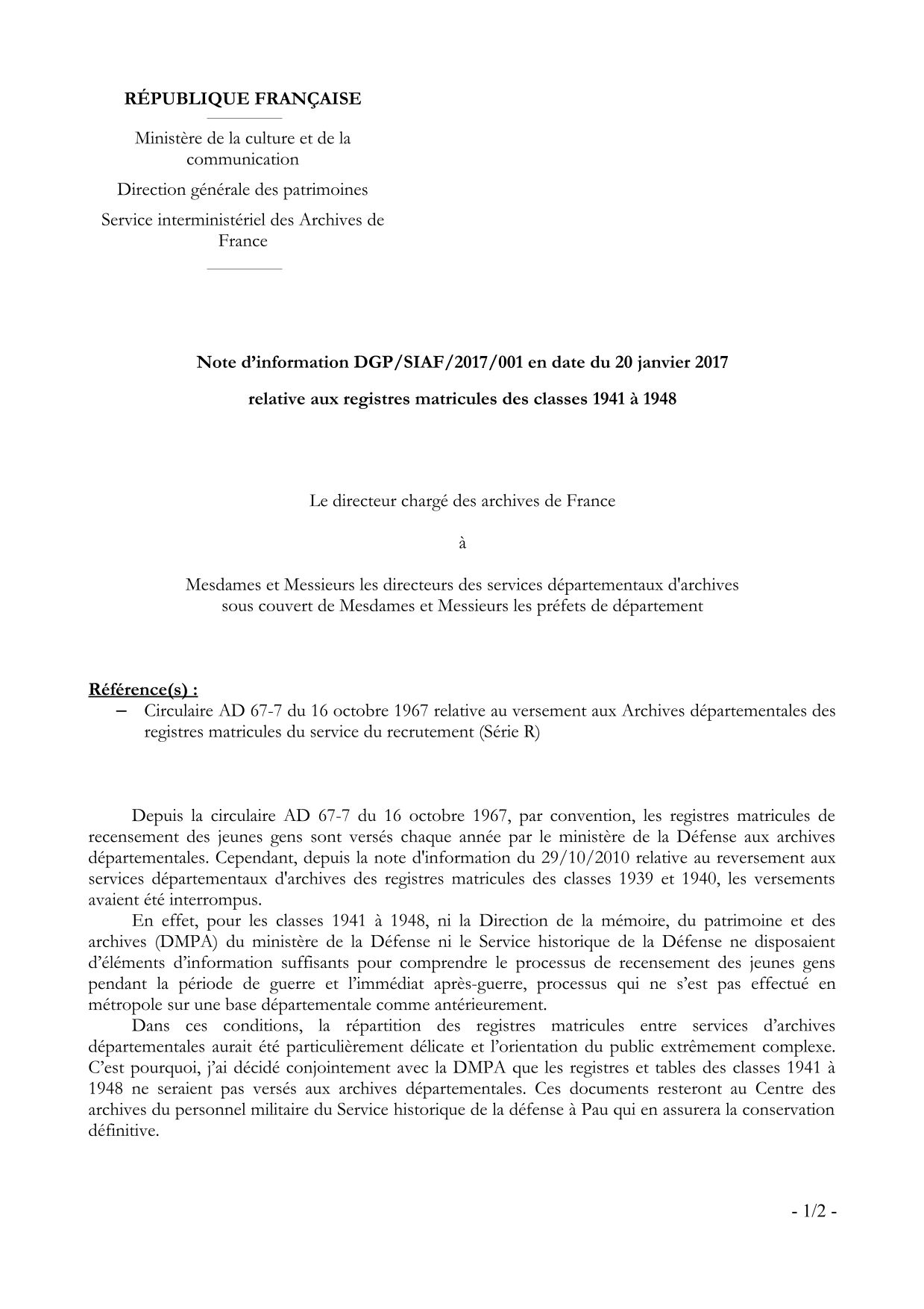 A noter que les classes 1941 à 1948 ne seront jamais versées aux Archives départementales, conformément à la note d’information DGP/SIAF/2017/001 en date du 20 janvier 2017 relative aux registres matricules des classes 1941 à 1948. Elles ne sont en effet pas classées par département.
