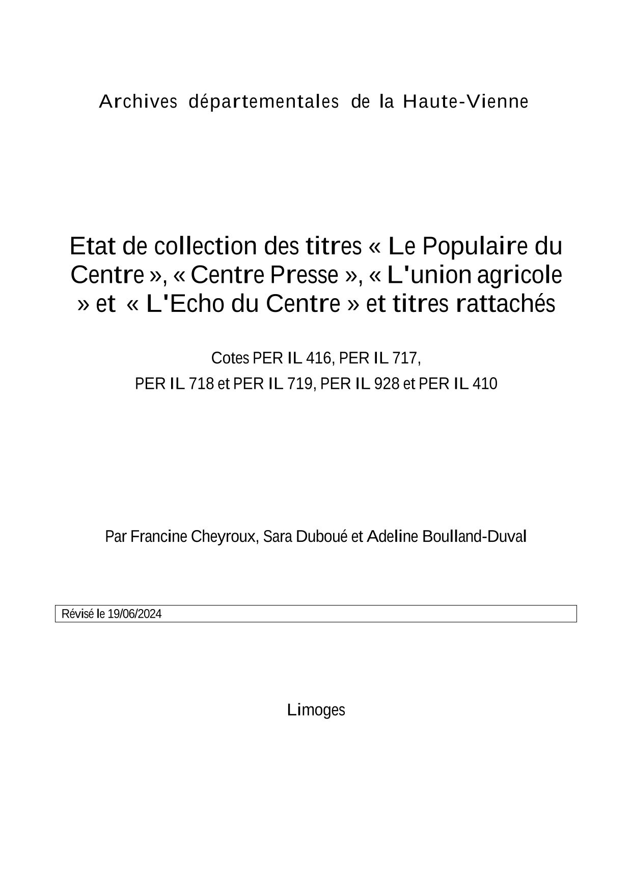 Plusieurs titres de la presse locale ont par ailleurs été numérisés et mis en ligne par la Bibliothèque Francophone Multimédia de Limoges, et une partie des bulletins des principales sociétés savantes régionales, parmi lesquelles la Société archéologique et historique du Limousin, est consultable sur Gallica .