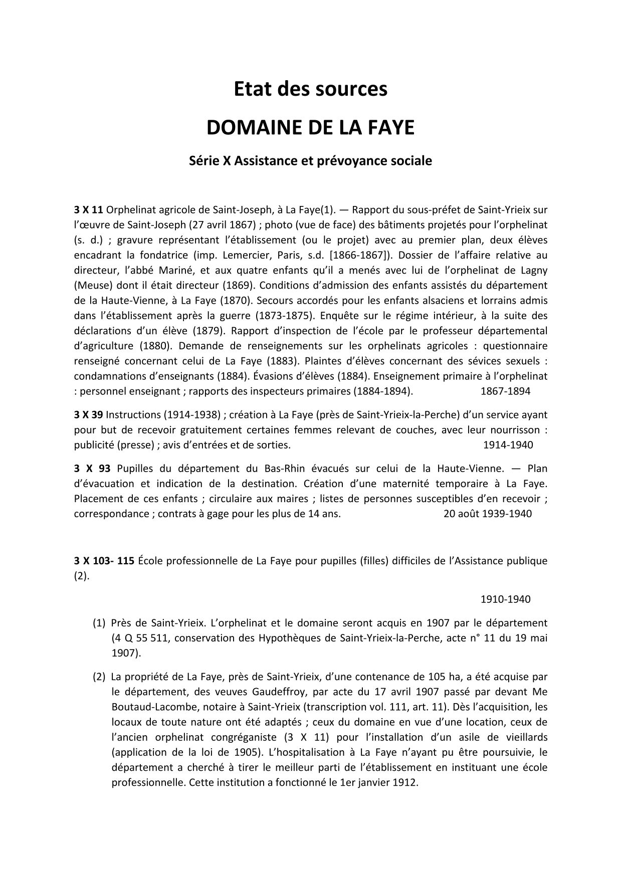 Les Archives départementales de la Haute-Vienne conservent de nombreuses séries où le domaine de la Faye est mentionné.