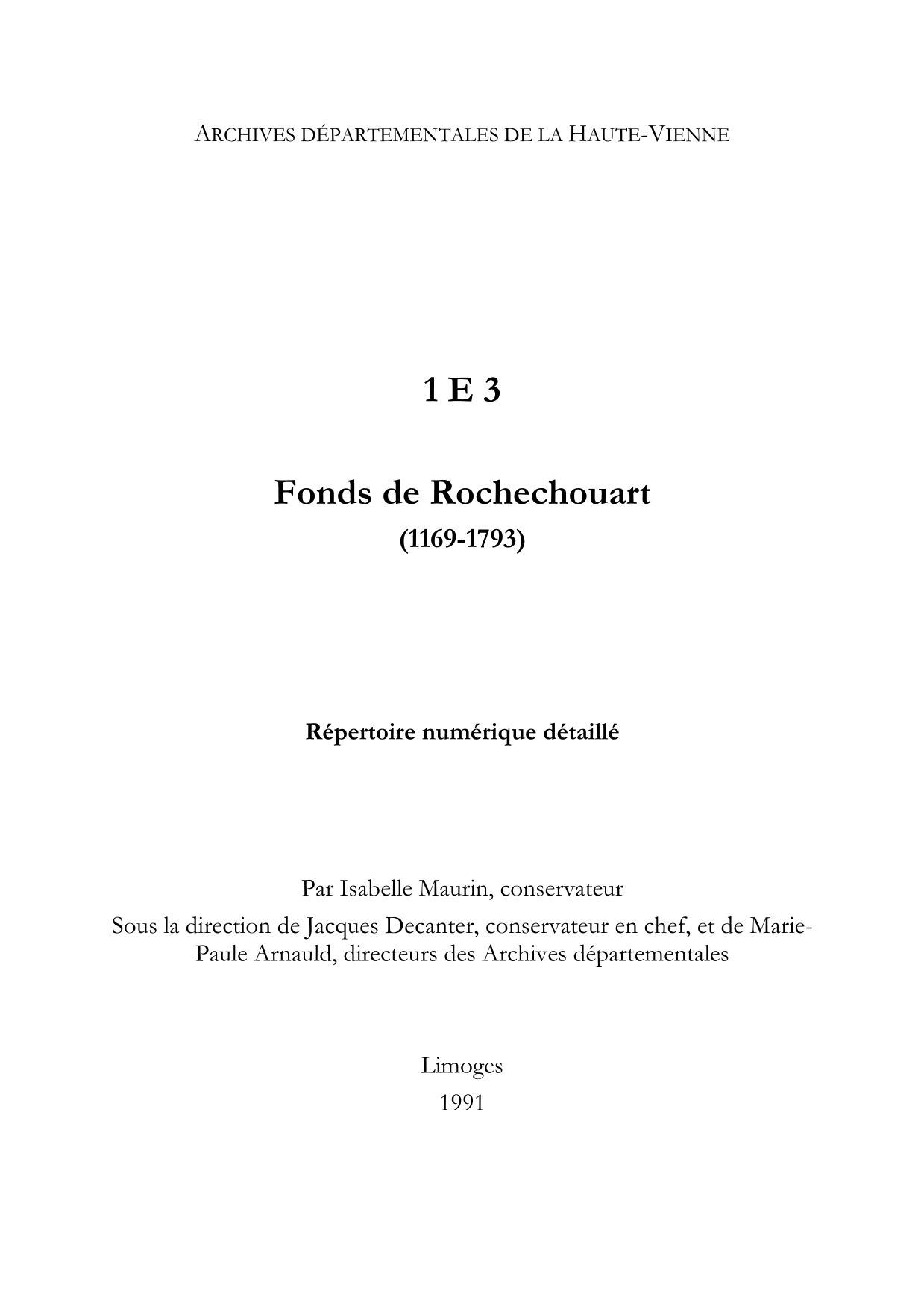 1 E 3. Archives de la famille de Rochechouart [extrait de Archives des familles de Pierre-Buffière et de Rochechouart, répertoire numérique détaillé des sous-séries 1 E 2 et 1 E 3, tableaux généalogiques, index, par Isabelle Maurin, 1991, 81 p.