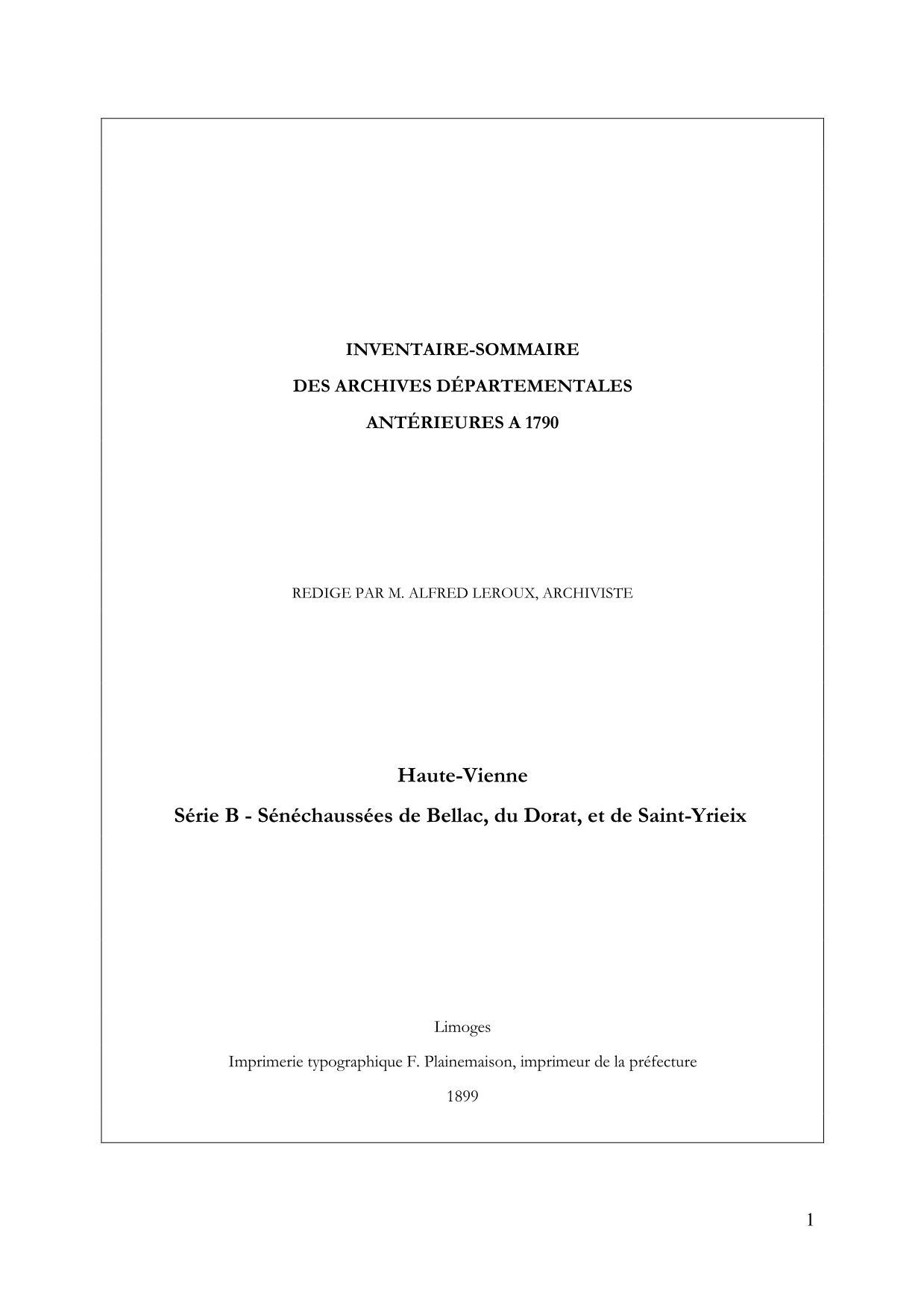 Les archives judiciaires antérieures à la Révolution sont assez abondantes. La majeure partie d'entre elles,soit environ 100 mètres sur 148, versée seulement à la fin du XIXe siècle, n'est pas accessible faute de classement. L'essentiel des fonds conservés remonte seulement au XVIIe siècle. En 1899, Alfred Leroux publie l'inventaire sommaire des sénéchaussées de Bellac, Le Dorat et Saint-Yrieix. Le désordre des archives, à leur arrivée, explique que les fonds des sénéchaussées de Bellac et du Dorat comportent chacun un supplément, et que subsistent encore des suppléments non classés pour les trois sénéchaussées. Entre 1993 et 1998, Marigeorges Allabert a inventorié les registres de plusieurs juridictions. Voir Introduction à l'inventaire sommaire de la série B - sénéchaussées de Bellac, du Dorat et de Saint-Yrieix.
