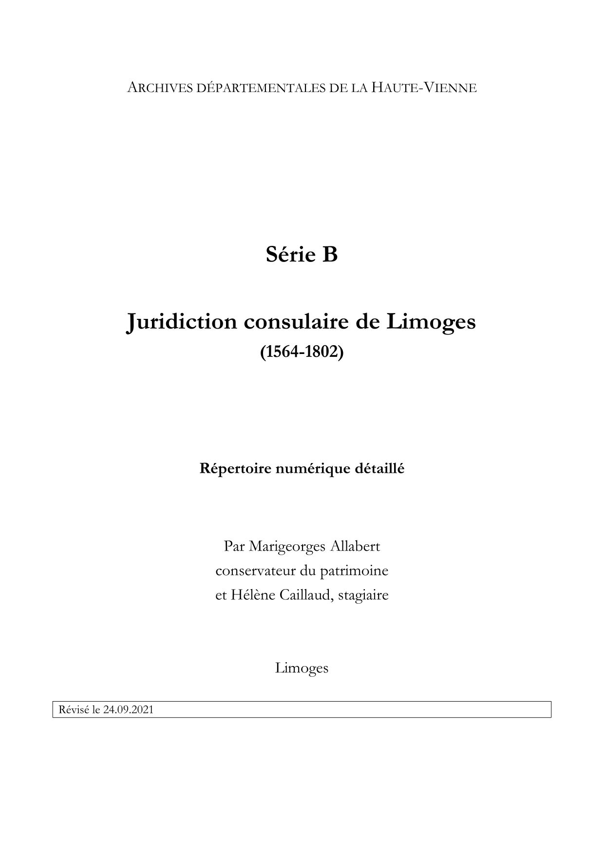 Répertoire numérique, par Marigeorges Allabert, 1998, et Hélène Caillaud, 2018, 32 p.