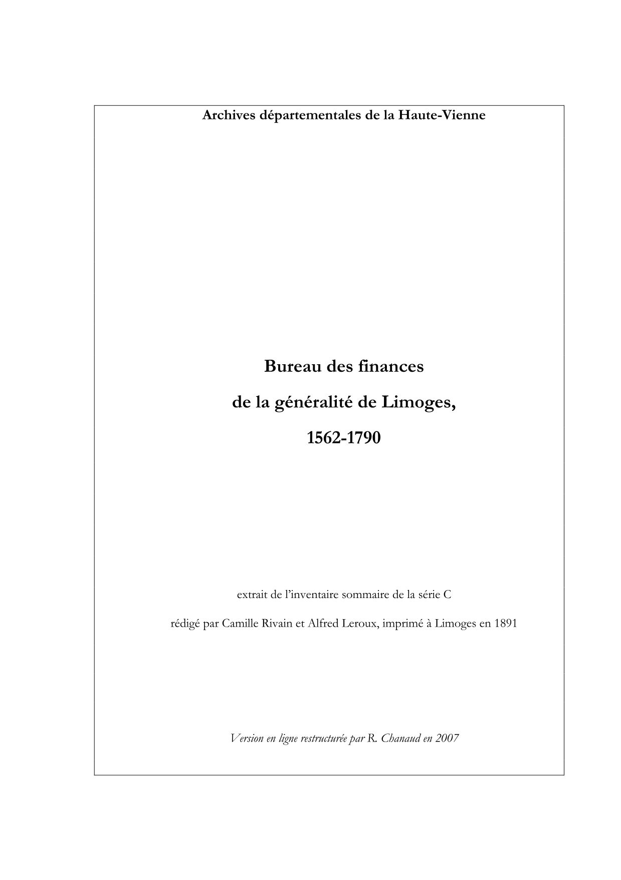 Inventaire sommaire imprimé de la série C, par C. Rivain et A. Leroux, 1891, CXLVI - 294 p. Couvre les cotes C 1- 637. Inventaire sommaire imprimé de la série C, par C. Rivain et A. Leroux, restructuré par R. Chanaud en 2007.
