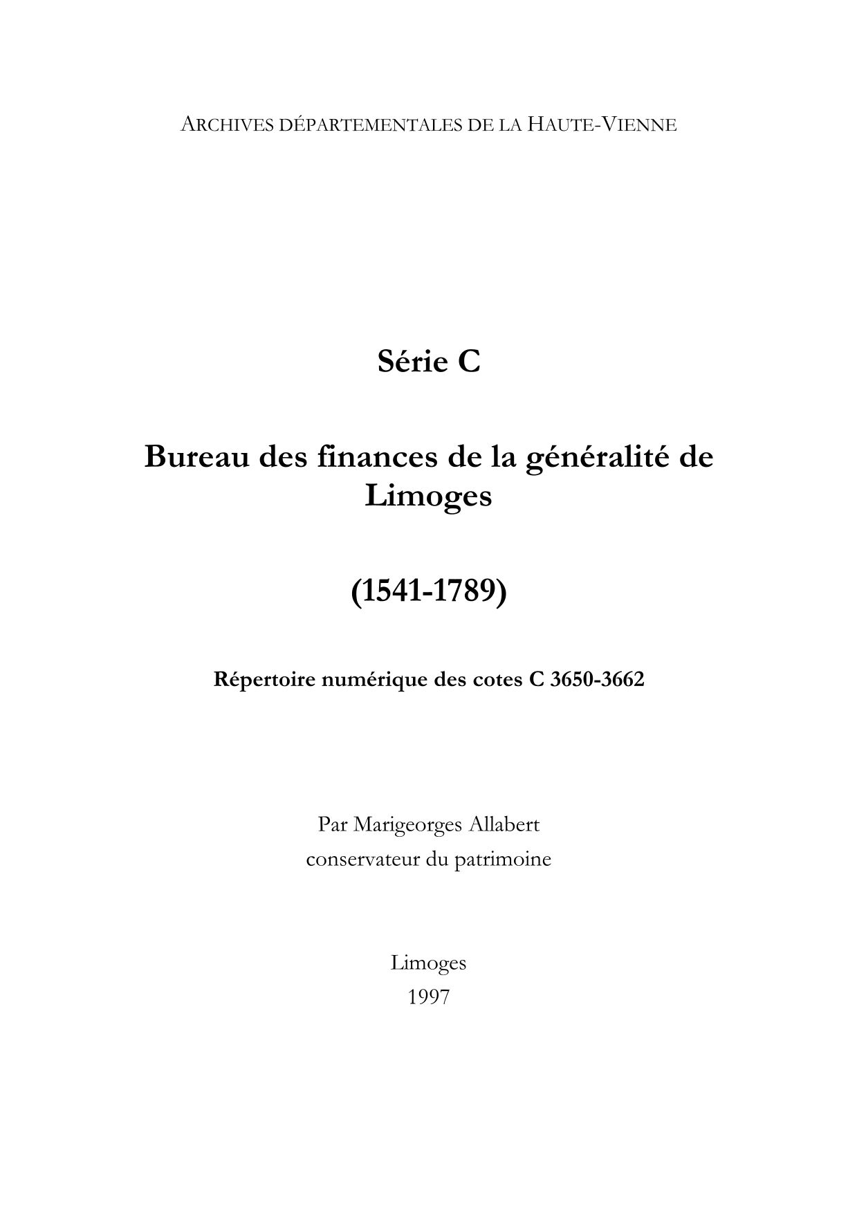 Répertoire numérique des cotes C 3650-3662, par M. Allabert, 1997, 1 p. dact.