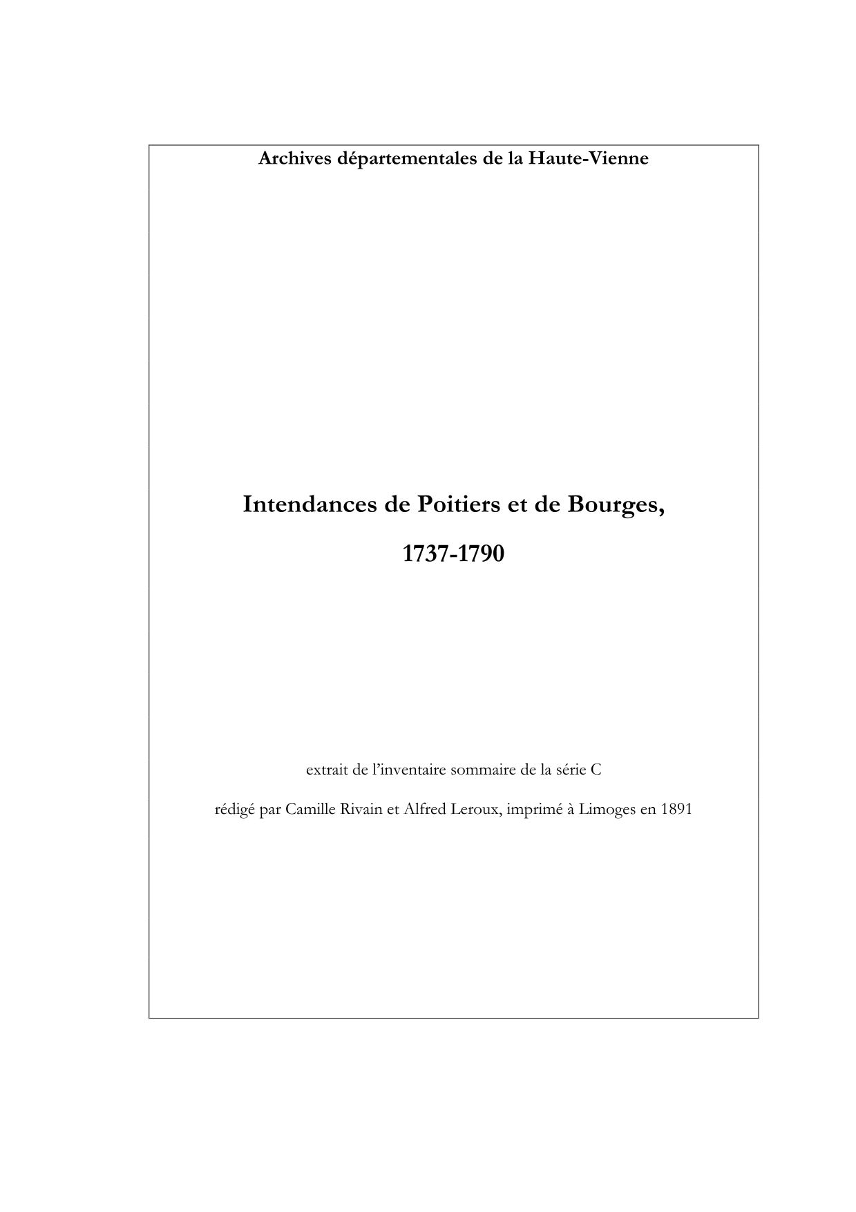 Inventaire sommaire imprimé de la série C, par C. Rivain et A. Leroux, 1891, CXLVI - 294 p. Couvre les cotes C 1- 637. Inventaire sommaire imprimé de la série C, par C. Rivain et A. Leroux.