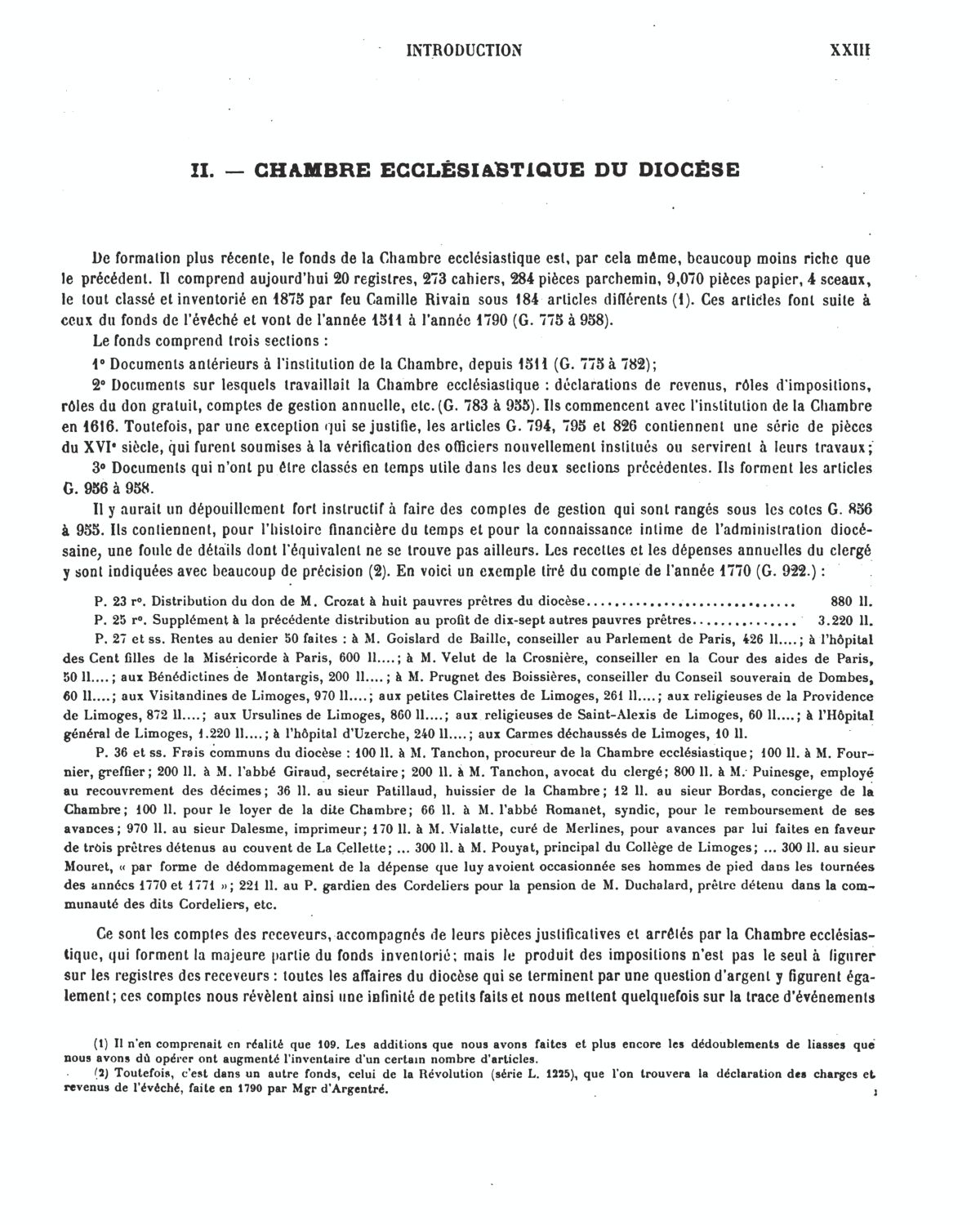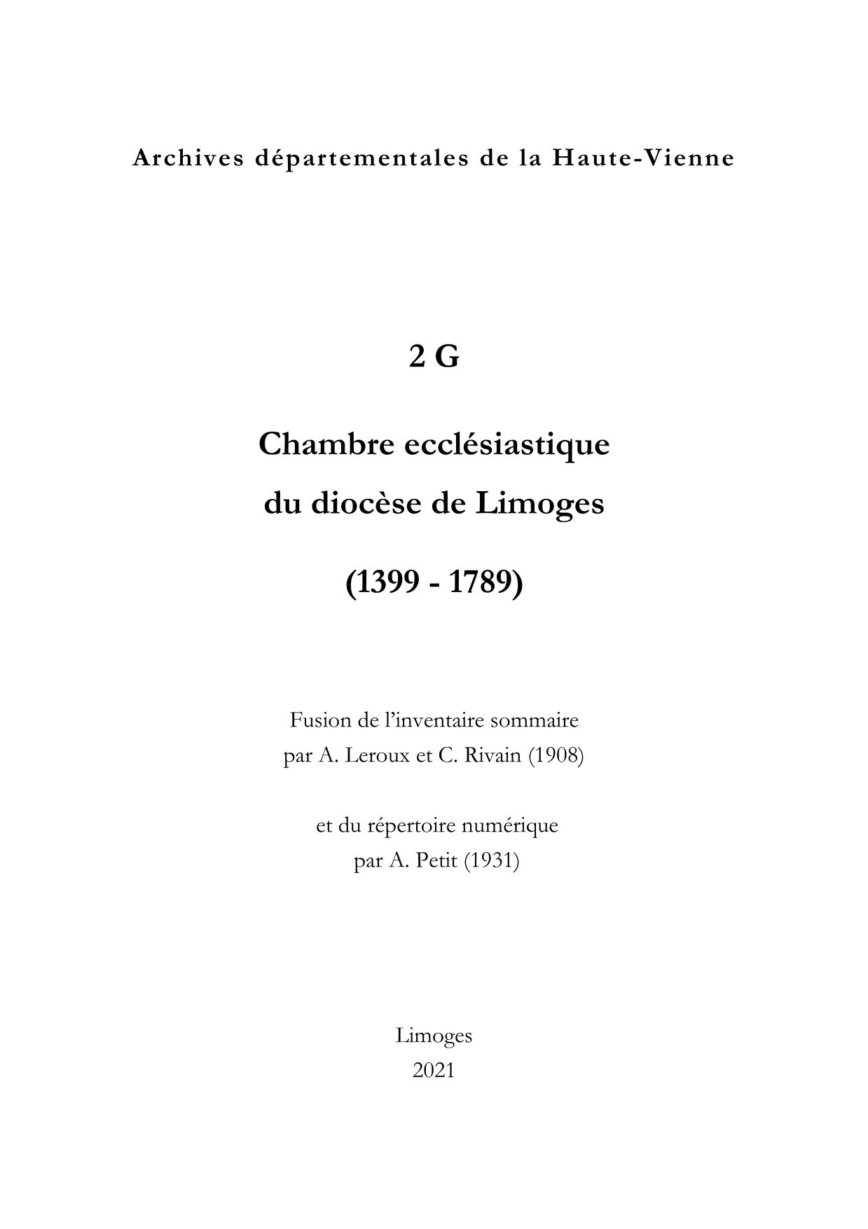 2 G. Inventaire sommaire imprimé des cotes G 775 à 958, par A. Leroux et C. Rivain, 1908. 2 G. Inventaire sommaire imprimé des fonds de l'évêché et de la chambre ecclésiastique, 1908, XXIX-316 p. : introduction relative au fonds de la chambre ecclésiastique, [VII p.], par C. Rivain. 2 G. Inventaire sommaire imprimé des fonds de l'évêché et de la chambre ecclésiastique, par A. Leroux et C. Rivain, 1908, XXIX-316 p. : inventaire du fonds de la chambre ecclésiastique, [26 p.]. 2 G. Index des noms de lieux cités dans l'inventaire sommaire, [par E. Israël], 291 p. dactyl. 2 G. Index des noms de personnes cités dans l'inventaire sommaire, [par E. Israël et O. Gibaud], 359 p. dactyl. 2 G. Répertoire numérique imprimé de la série G, par A. Petit, Limoges, 1931, 66 p. : répertoire numérique de la sous-série 2 G en 1 p.