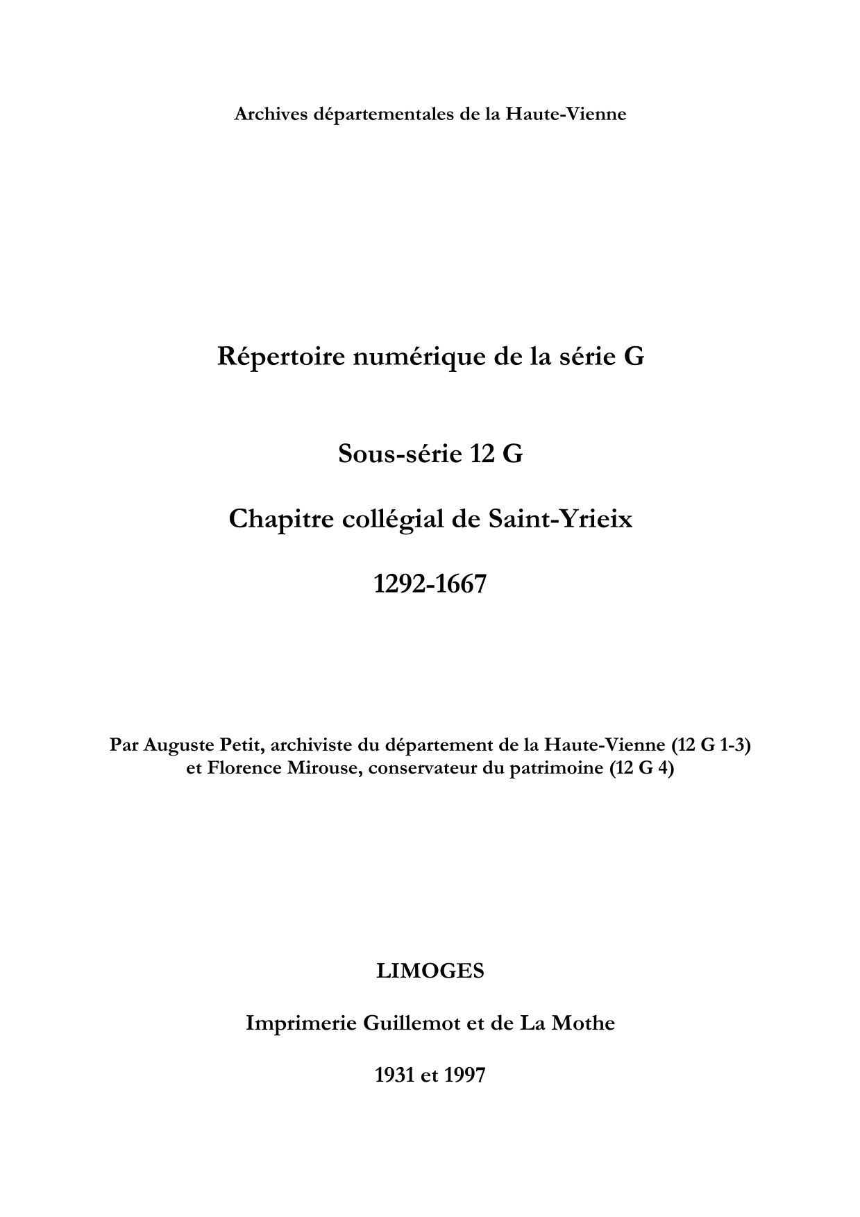 12 G. Répertoire numérique imprimé de la série G, par A. Petit, Limoges, 1931, 66 p. : répertoire numérique de la sous-série 12 G, [1 p.]. Concerne 12 G 1 à 3.