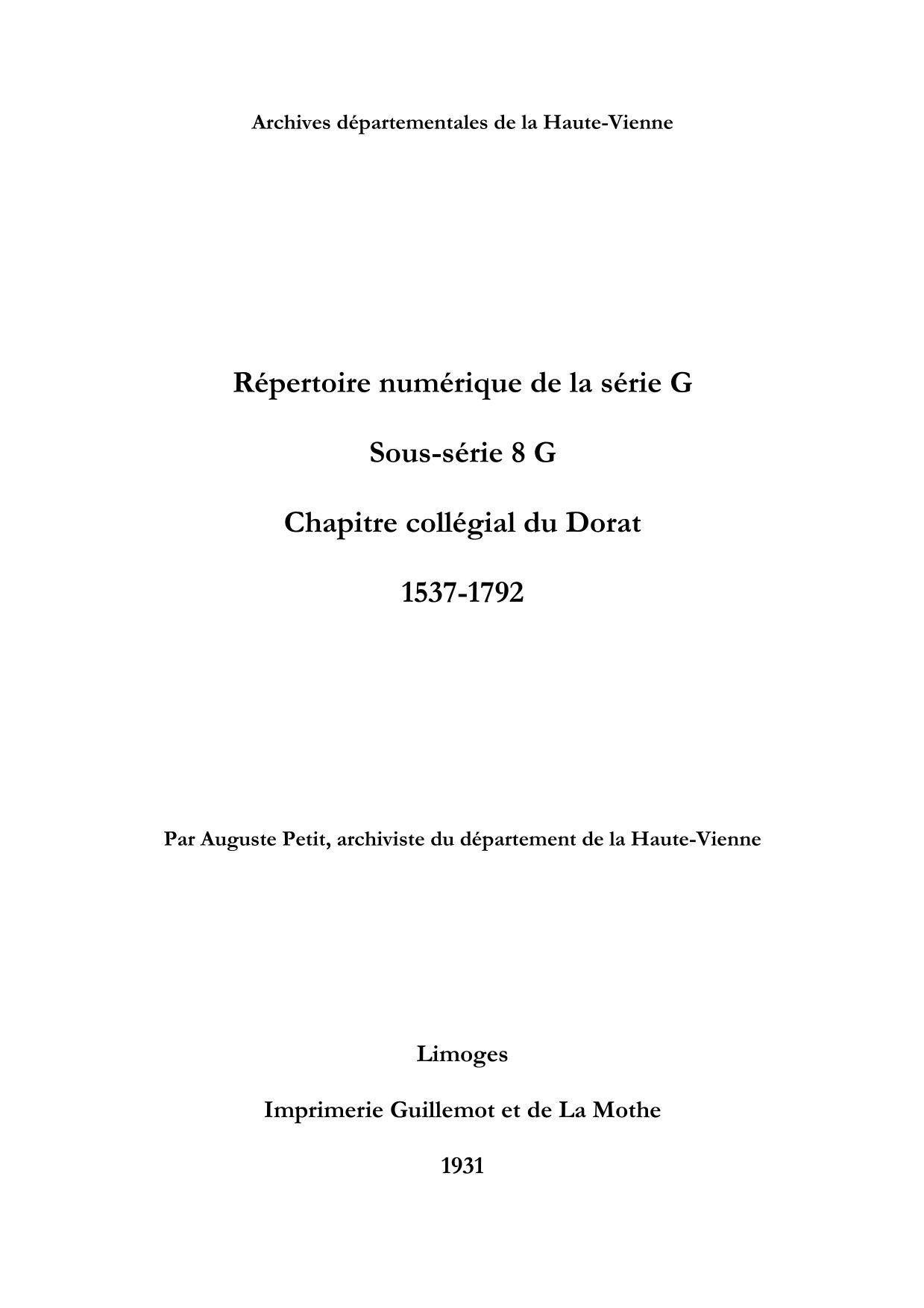 8 G. Répertoire numérique imprimé de la série G, par A. Petit, Limoges, 1931, 66 p. : répertoire numérique de la sous-série 8 G, [2 p., paginées 33 et 48].