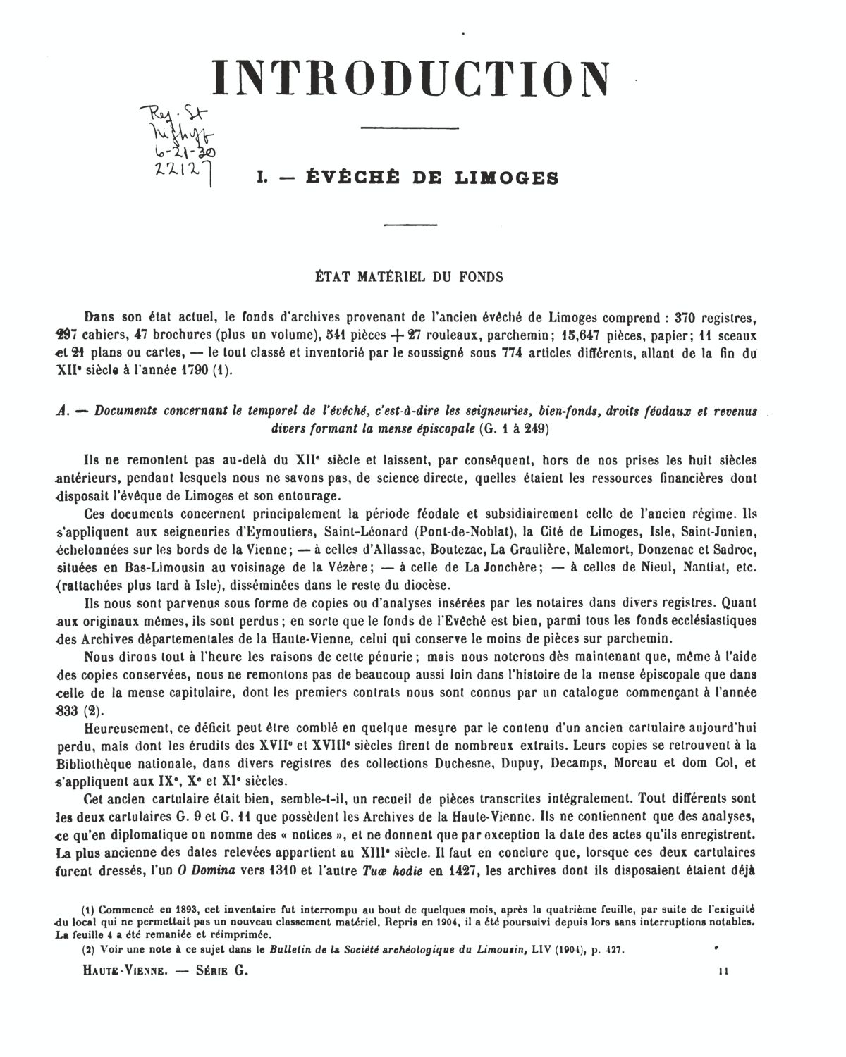 Le diocèse de Limoges était sous l'Ancien Régime l'un des plus vastes de France, puisque, jusqu'au XIVe siècle, il englobait approximativement les territoires des trois départements de l'ancienne région Limousin en y adjoignant les arrondissements de Nontron (Dordogne) et de Confolens (Charente). La création du diocèse de Tulle en 1317 ne lui enleva qu'une cinquantaine de paroisses sur un total de plus de neuf cents. On trouve dans ce fonds de nombreux articles concernant le temporel mais aussi la pastorale (écrits épiscopaux, discipline ecclésiastique, collations de bénéfices, visites pastorales, ordinations...) ainsi que les registres du greffe des insinuations ecclésiastiques : y sont enregistrés tous les actes concernant la possession des bénéfices séculiers ou réguliers et ceux relatifs à la juridiction spirituelle en général, tels que les dispenses pour mariage. Ce fonds est lacunaire, ayant eu à subir de nombreux aléas, dont l'incendie de 1823 qui éclata dans les locaux des Archives départementales. Initialement coté pour partie en G (inventaire d'A. Leroux) et en 1 G (répertoire d'A. Petit), ce fonds est aujourd'hui intégralement coté en 1 G. Les cotes à prendre en compte sont celles qui figurent dans la version de l'inventaire sommaire restructurée par F. Mirouse.