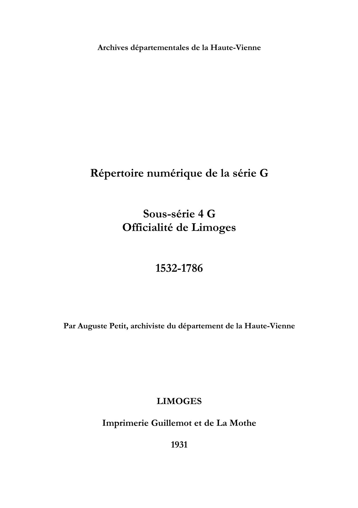 4 G. Répertoire numérique imprimé de la série G, par A. Petit, Limoges, 1931, 66 p. : répertoire numérique de la sous-série 4 G, [1 p.].