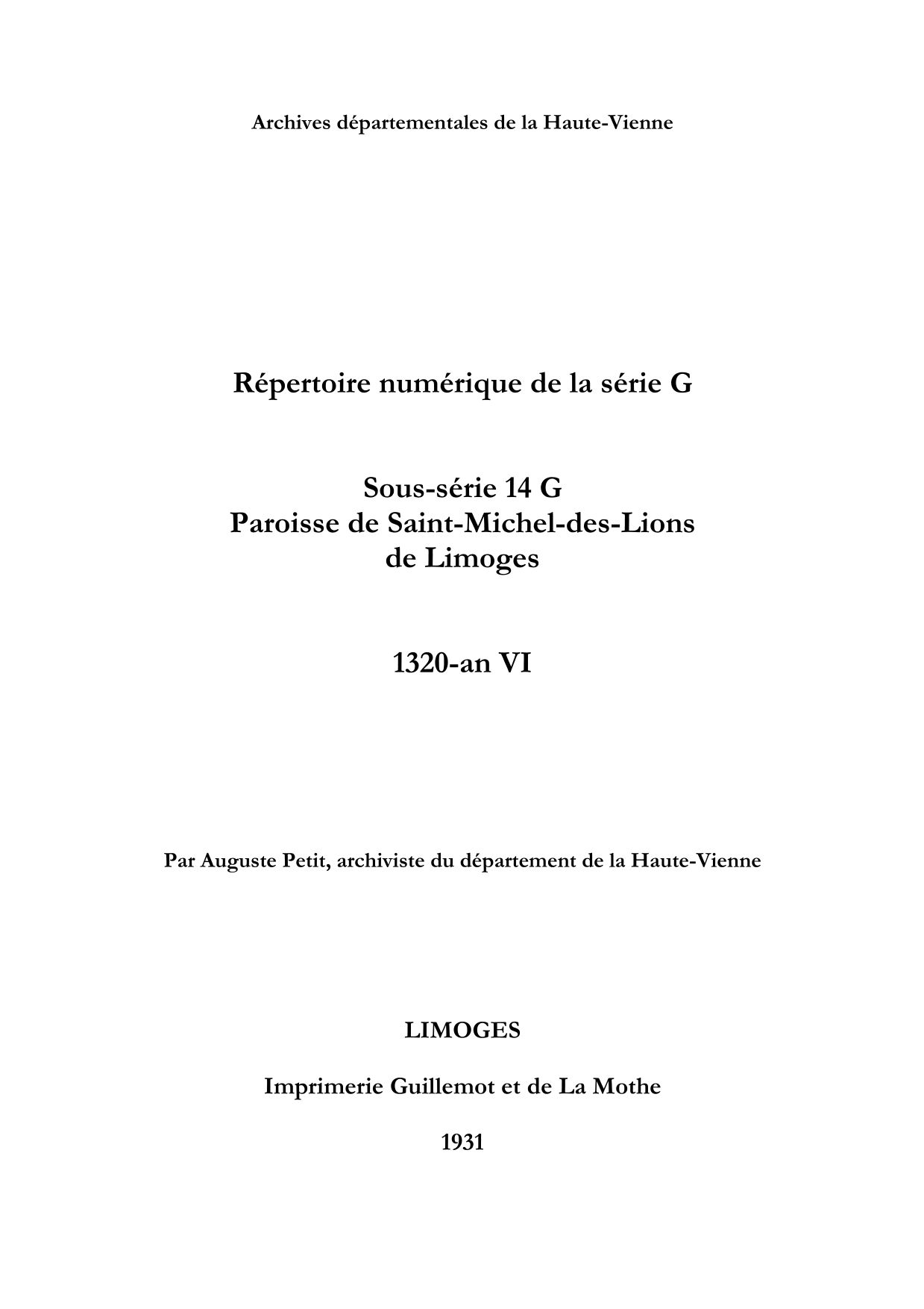 14 G. Répertoire numérique imprimé de la série G, par A. Petit, Limoges, 1931, 66 p. : répertoire numérique de la sous-série 14 G [1 p.].