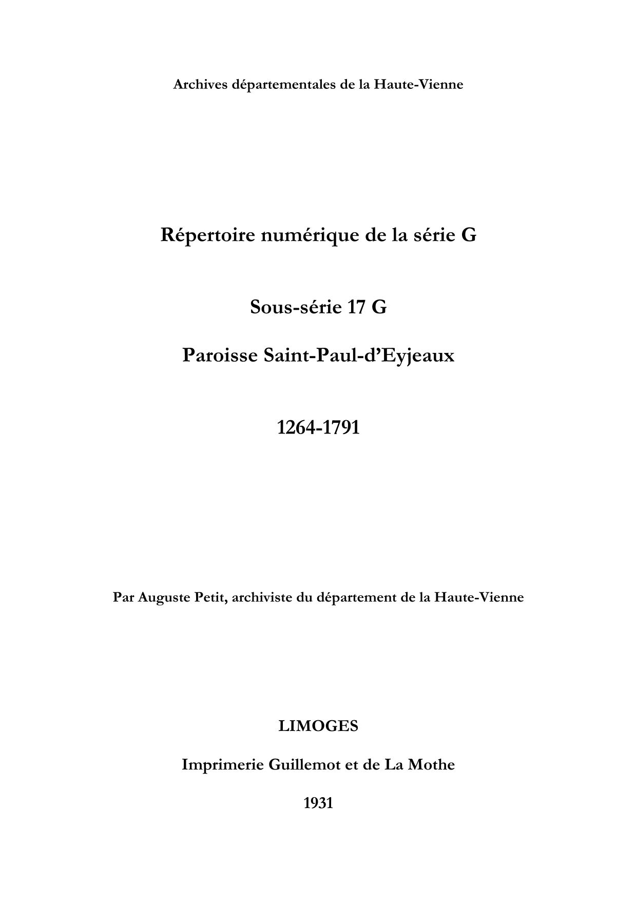 17 G. Répertoire numérique imprimé de la série G, par A. Petit, Limoges, 1931, 66 p. : répertoire numérique de la sous-série 17 G [1 p.].