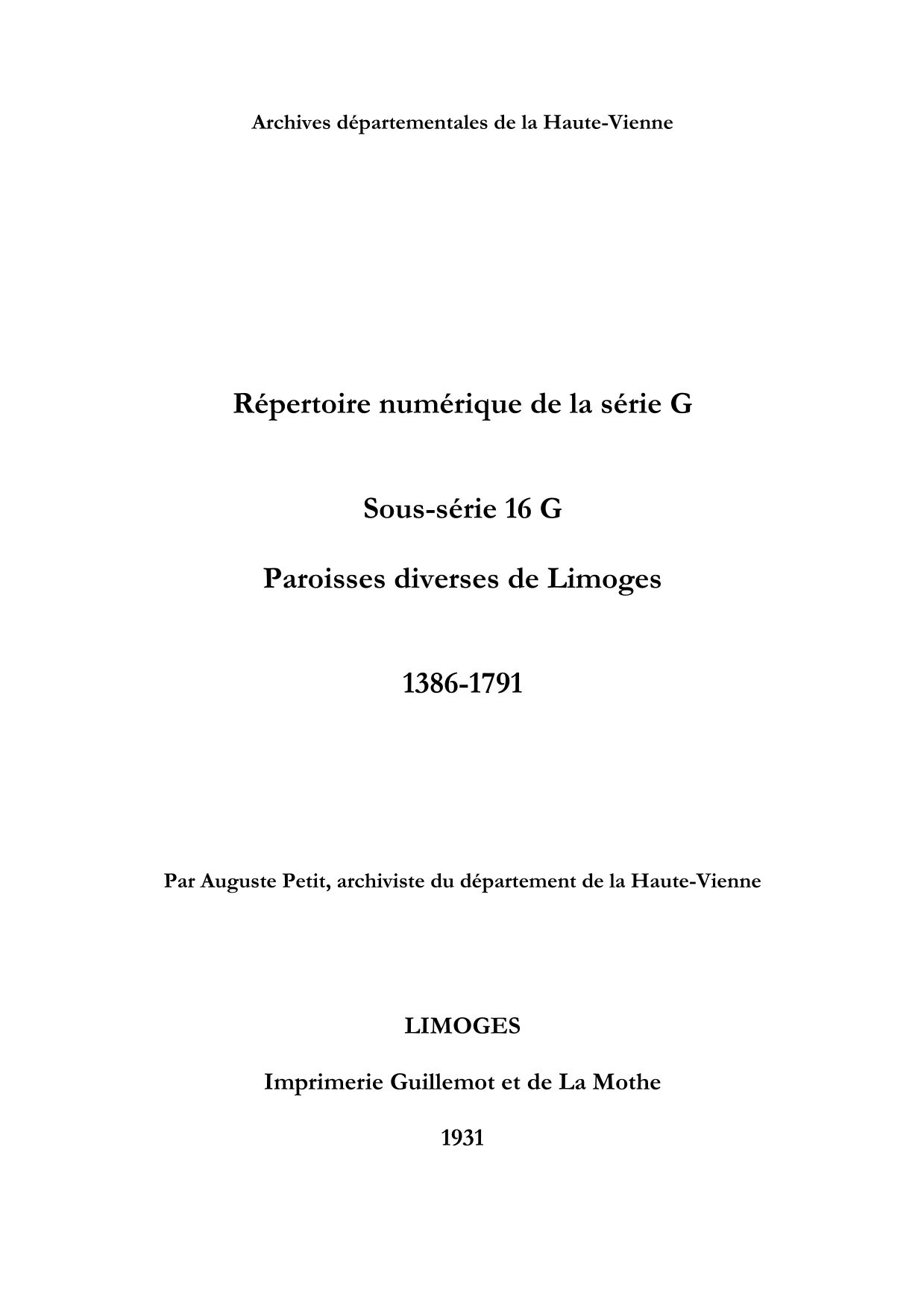 16 G. Répertoire numérique imprimé de la série G, par A. Petit, Limoges, 1931, 66 p. : répertoire numérique de la sous-série 16 G [1 p.].