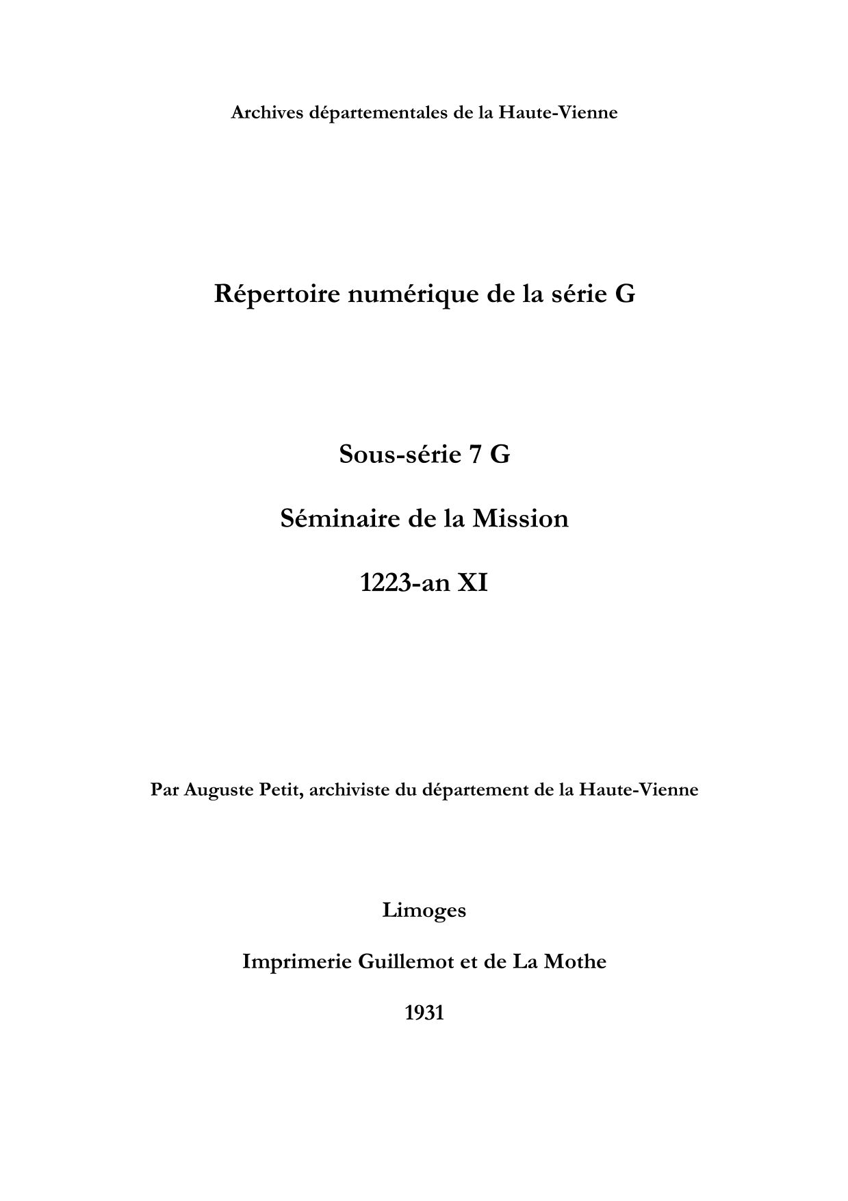 7 G. Répertoire numérique imprimé de la série G, par A. Petit, Limoges, 1931, 66 p. : répertoire numérique de la sous-série 7 G, [4 p.].