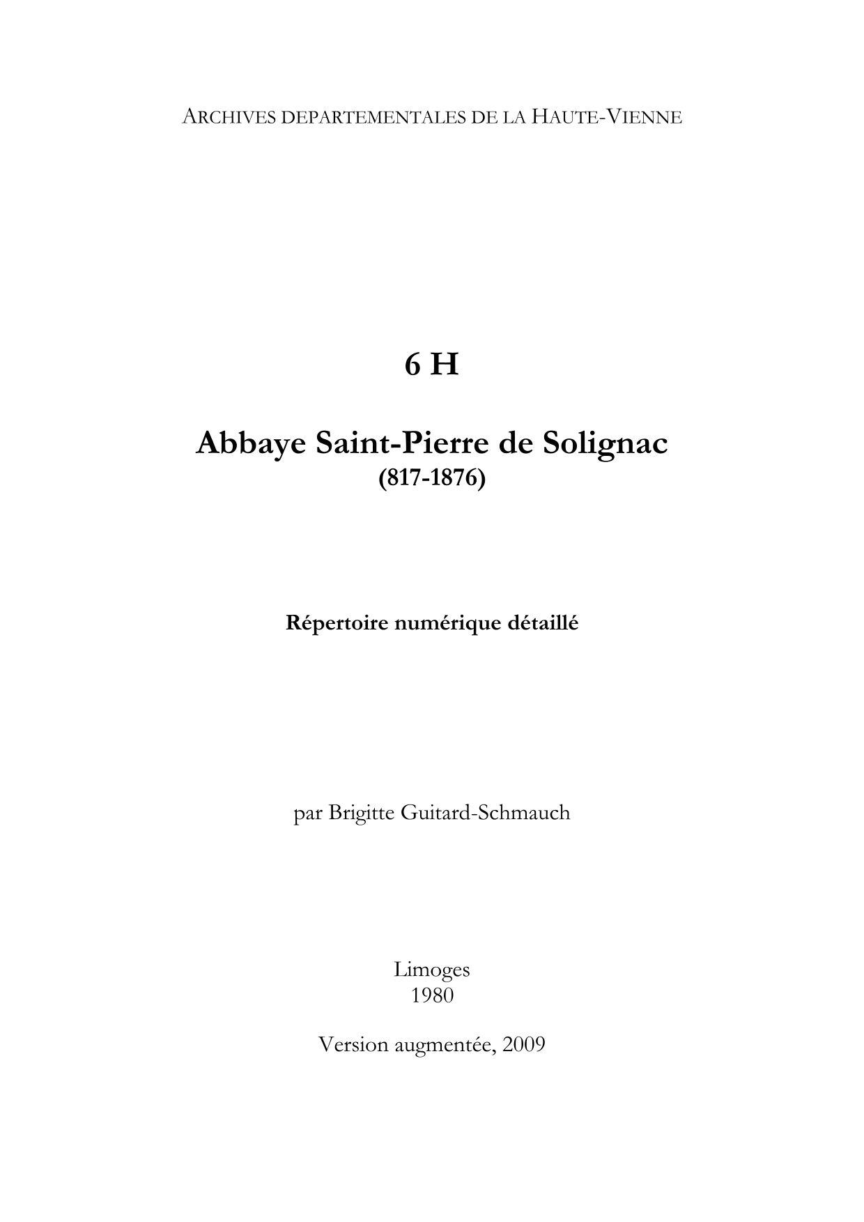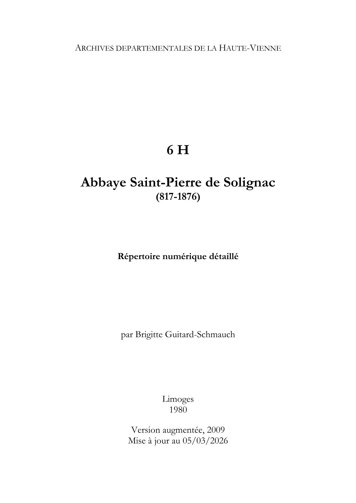 6 H. Répertoire numérique, par B. Guichard-Schmauch, 1980, [augmenté par A. Gérardot, d'une introduction, d'une bibliographie et de sources complémentaires, 2009]. 6 H. Concordance entre anciennes et nouvelles cotes, par B. Guichard-Schmauch, 58 p. dactyl.
