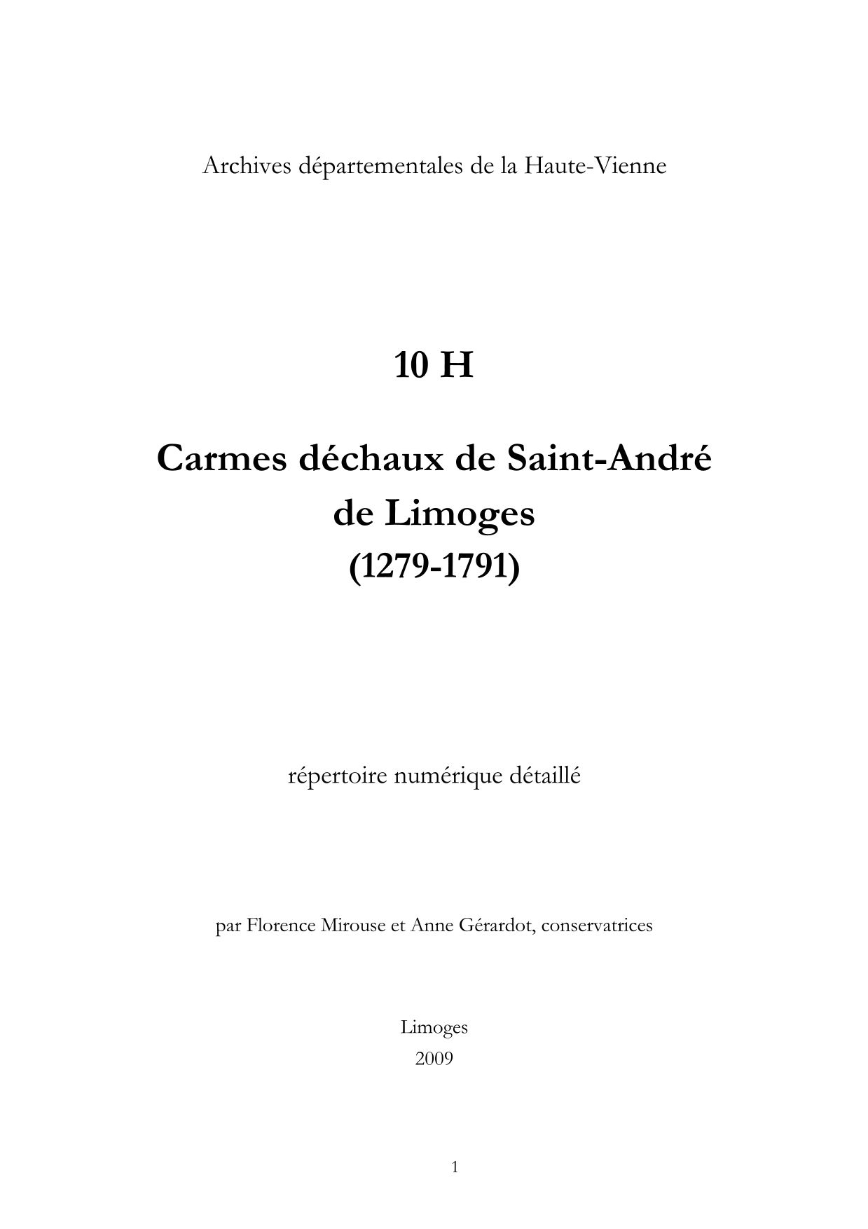 10 H. Répertoire numérique détaillé, par F. Mirouse et A. Gérardot, 2009, 44 p. dact., annexes et index.
