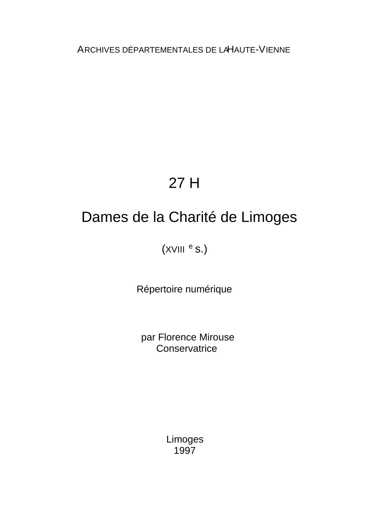 27 H. Répertoire numérique détaillé, par F. Mirouse, 1997, 1 p. dact.