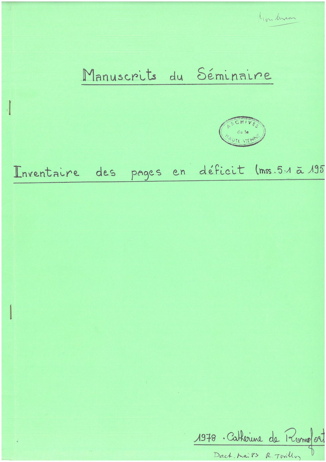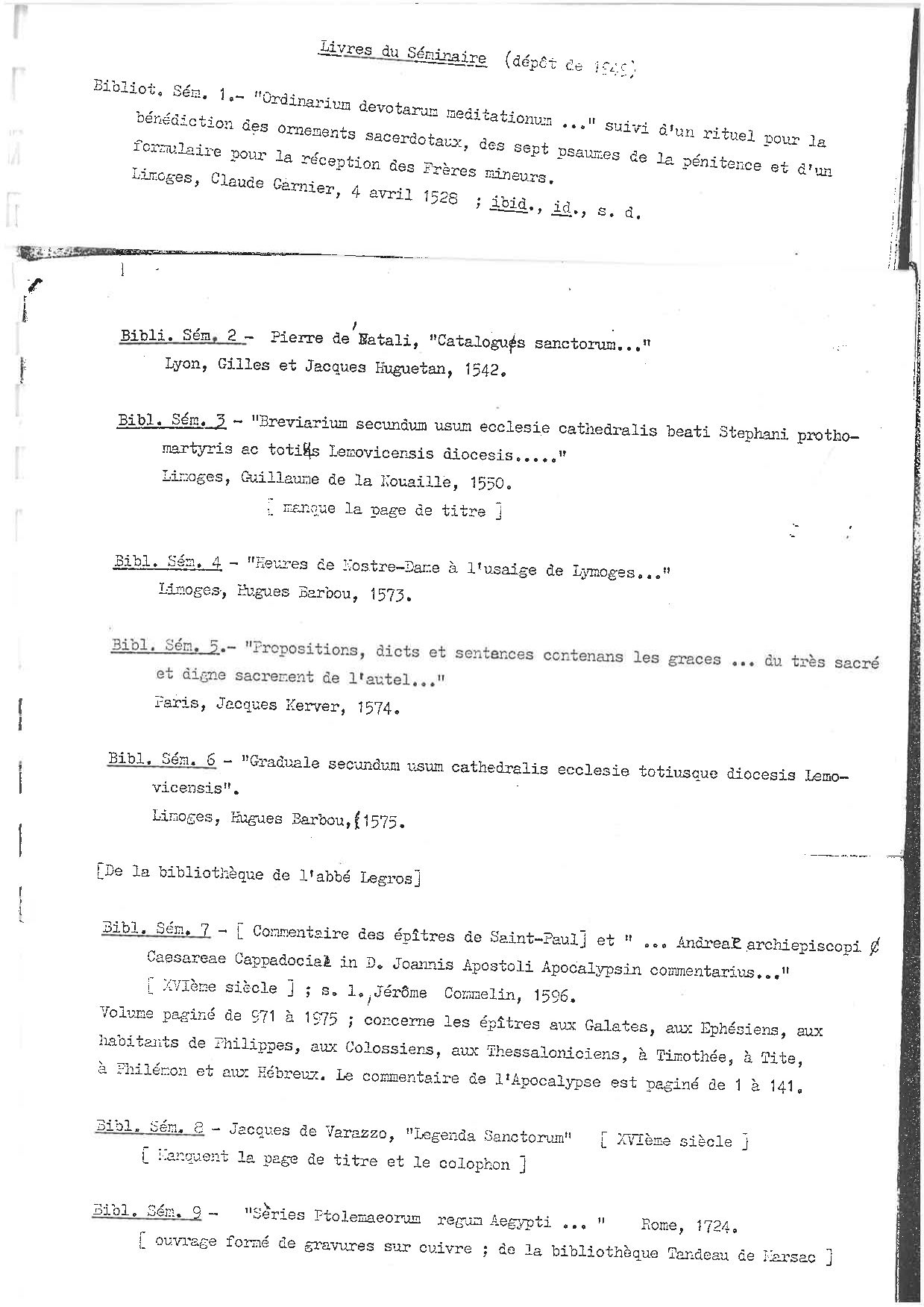 I Sem. Catalogue, par L. Guibert, dans Bulletin de la Société archéologique et historique du Limousin, t. 39, 1892, p. 456-558 (correspond aux cotes I Sem 1 à 205). -- I Sem. Catalgue, par M. Duchein, dans Catalogue général des manuscrits des bibliothèques publiques de France, t. 51, 1956, p. 444-465 (correspond aux cotes I Sem 1 à 286, auxquelels ont été surajoutées des cotes "Mss" 103 à 358 inemployées). -- I Sem et Bib Sem. Catalogue, par J. Decanter, 1962, 3 p. dact. (correspond aux cotes I Sem 287 à 292 et Bib Sem 1 à 19).