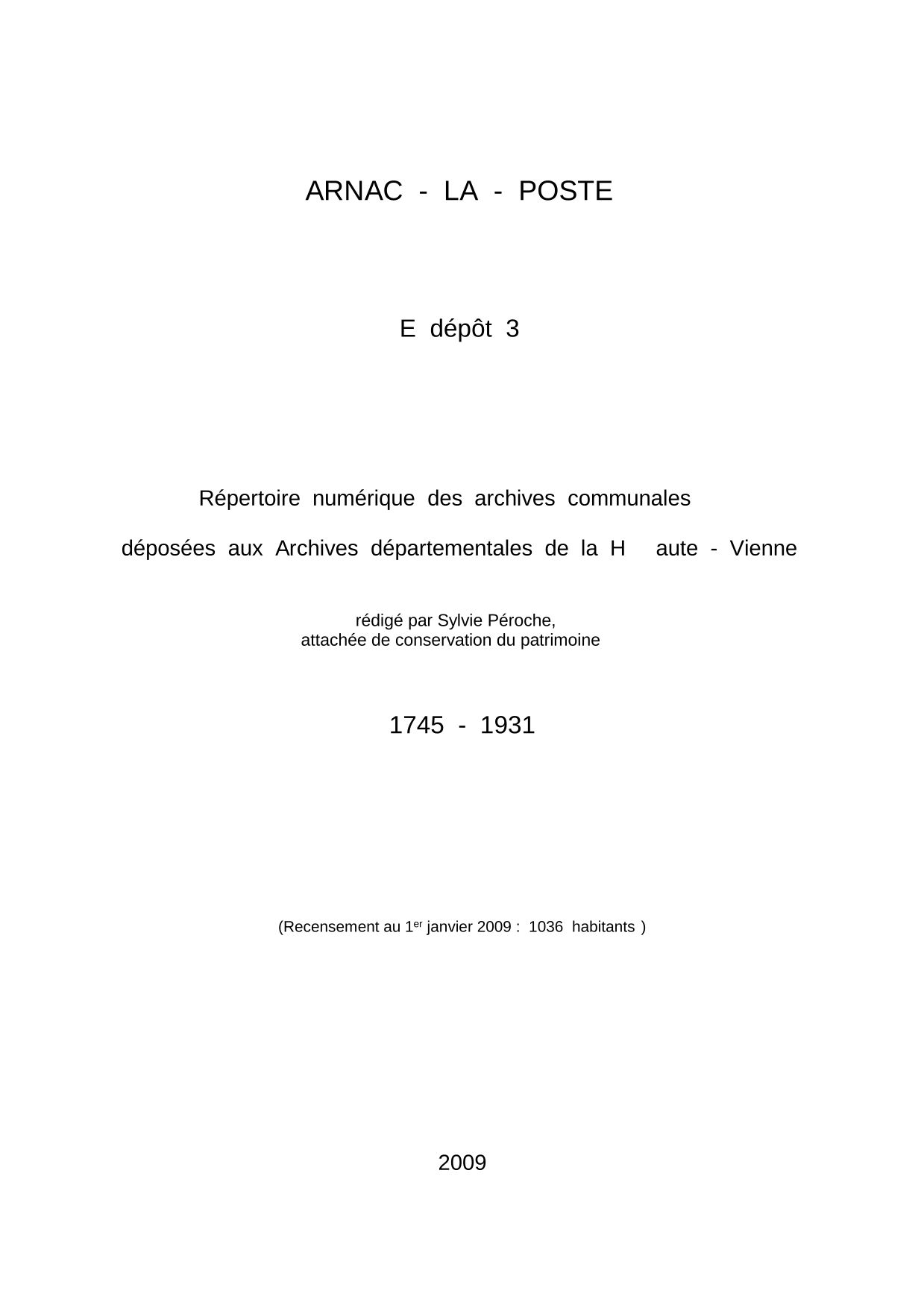 Commune d'Arnac-la-Poste. Répertoire numérique des archives communales déposées aux Archives départementales de la Haute-Vienne, par S. Péroche, 2009, 8 p. dact.