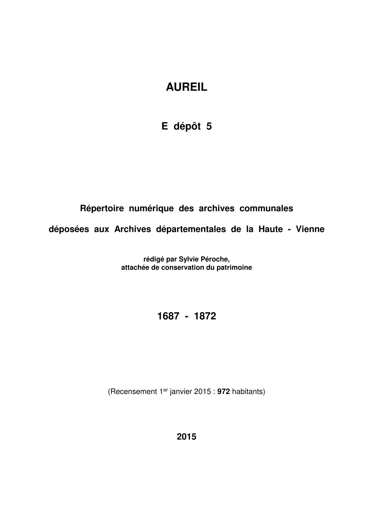 Commune d'Aureil. Répertoire numérique des archives communales déposées aux Archives départementales de la Haute-Vienne, par S. Péroche, 2015, 17 p. dact.