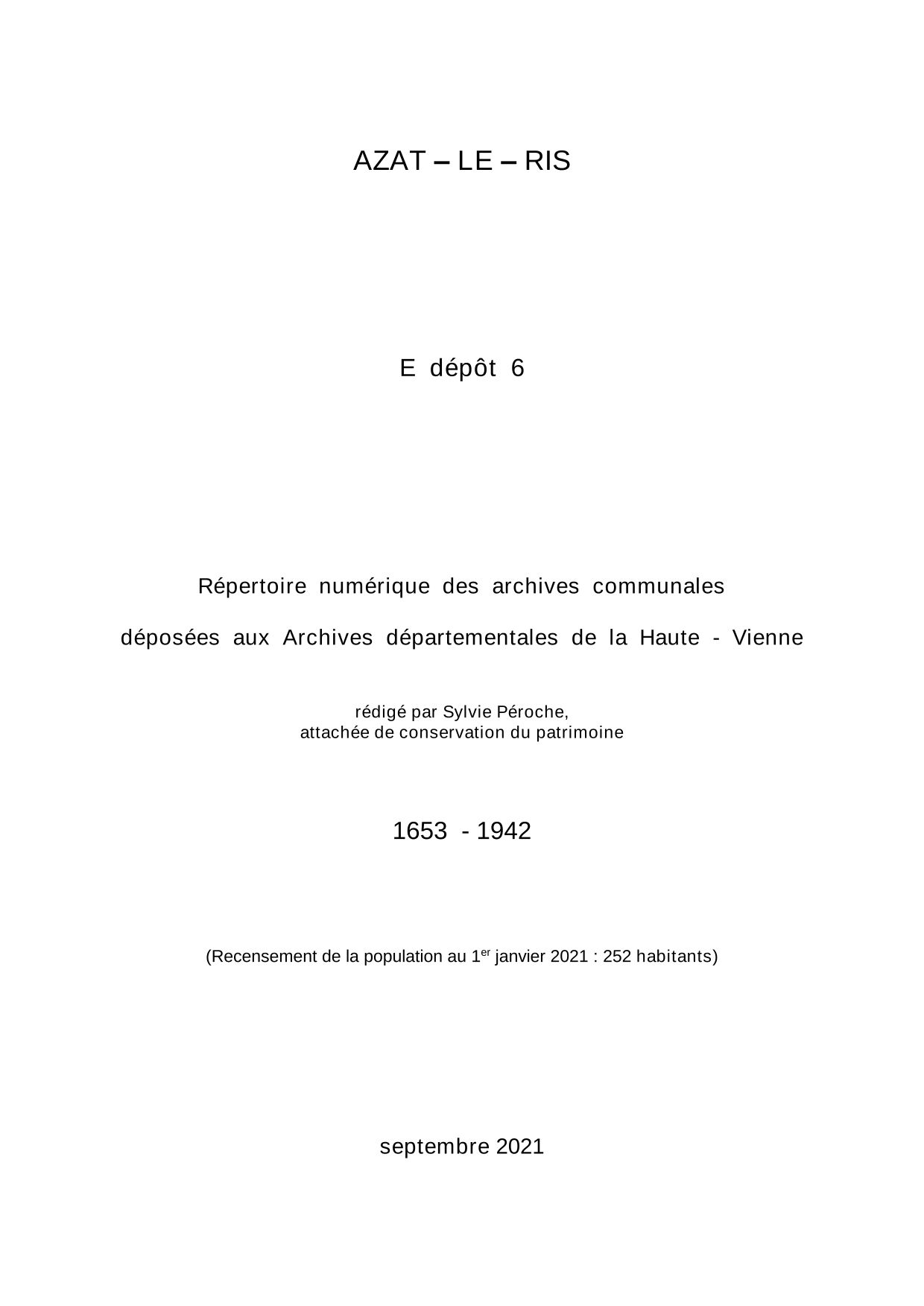 Commune d'Azat-le-Ris. Répertoire numérique des archives communales déposées aux Archives départementales de la Haute-Vienne, par S. Péroche, 2021, 14 p. dact.