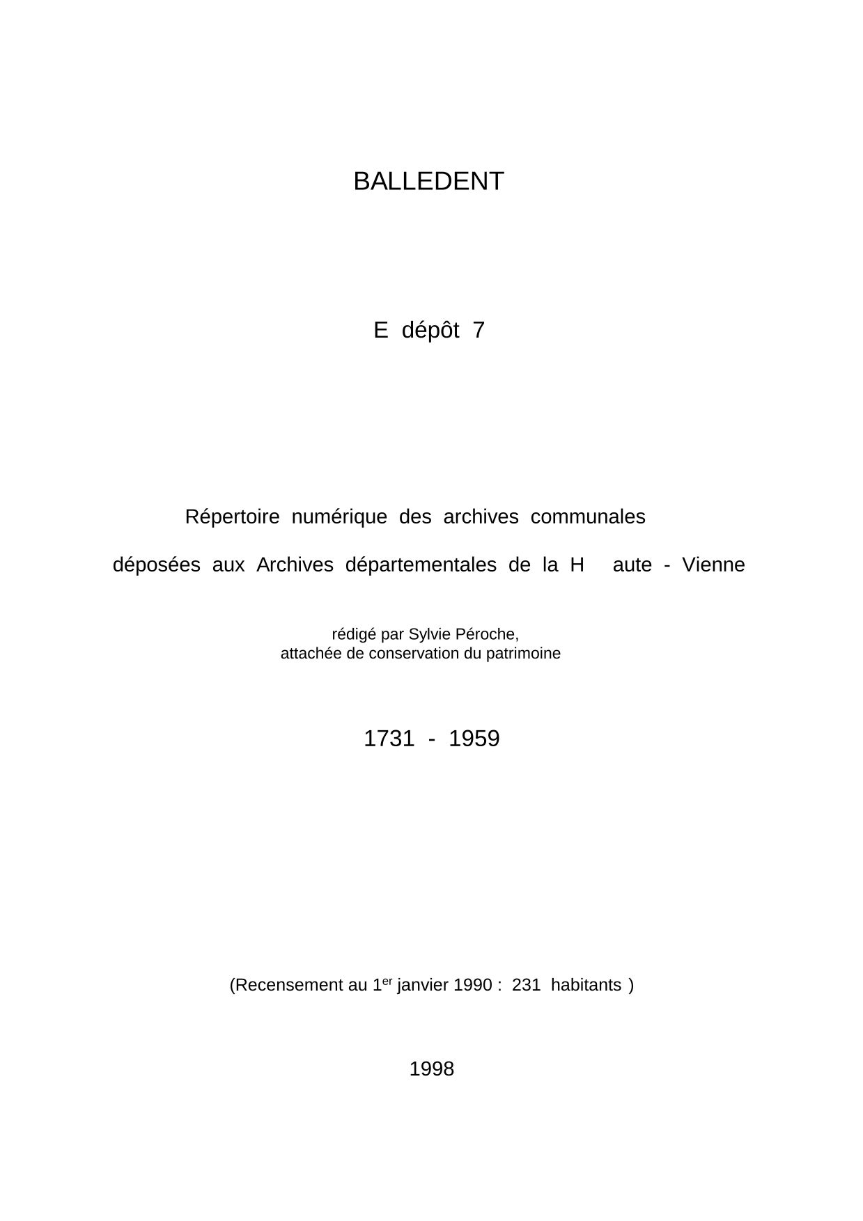 Commune de Balledent. Répertoire numérique des archives communales déposées aux Archives départementales de la Haute-Vienne, par S. Péroche, 1998, 12 p. dact.