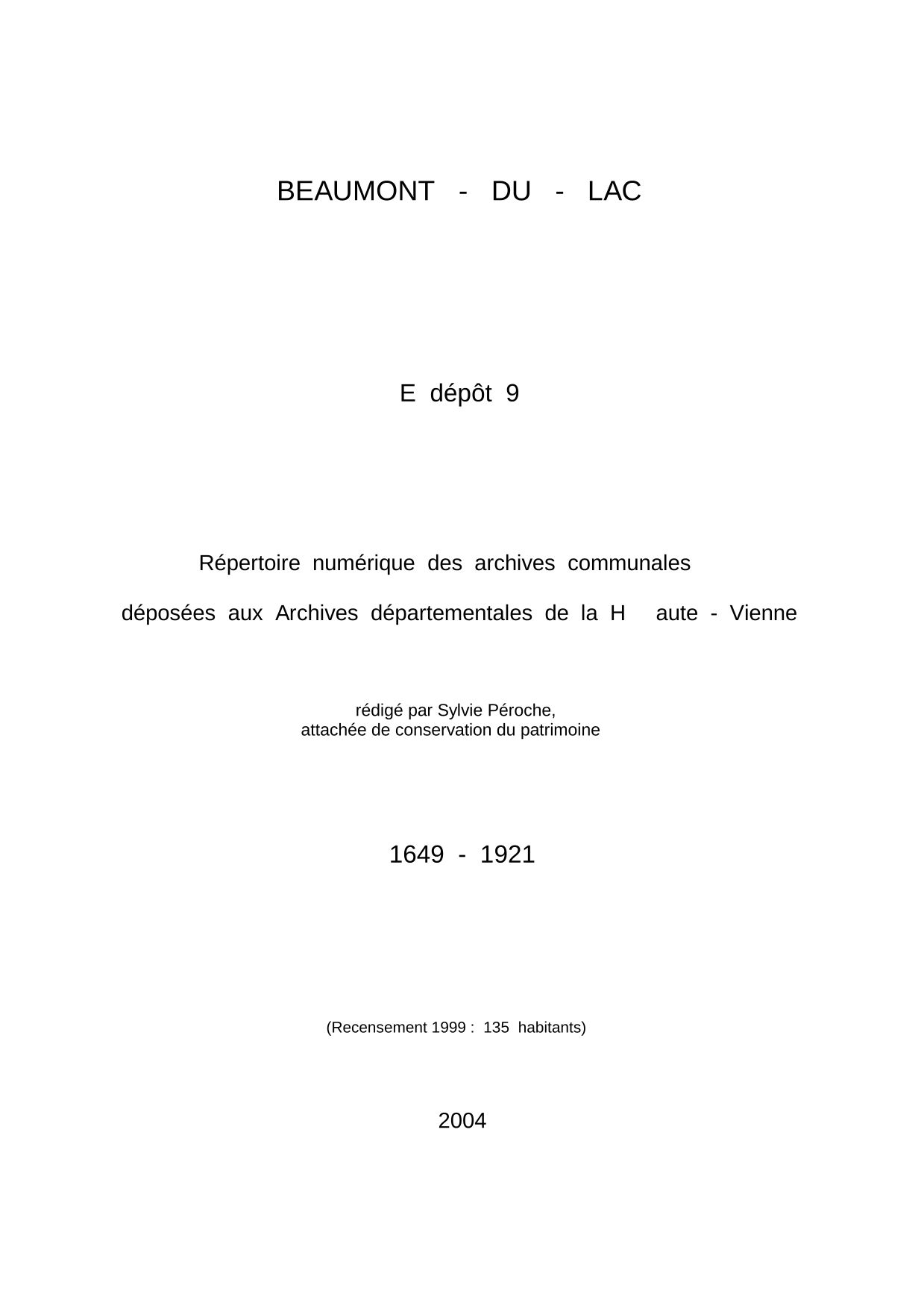 Commune de Beaumont-du-Lac. Répertoire numérique des archives communales déposées aux Archives départementales de la Haute-Vienne, par S. Péroche, 2004, 13 p. dact.