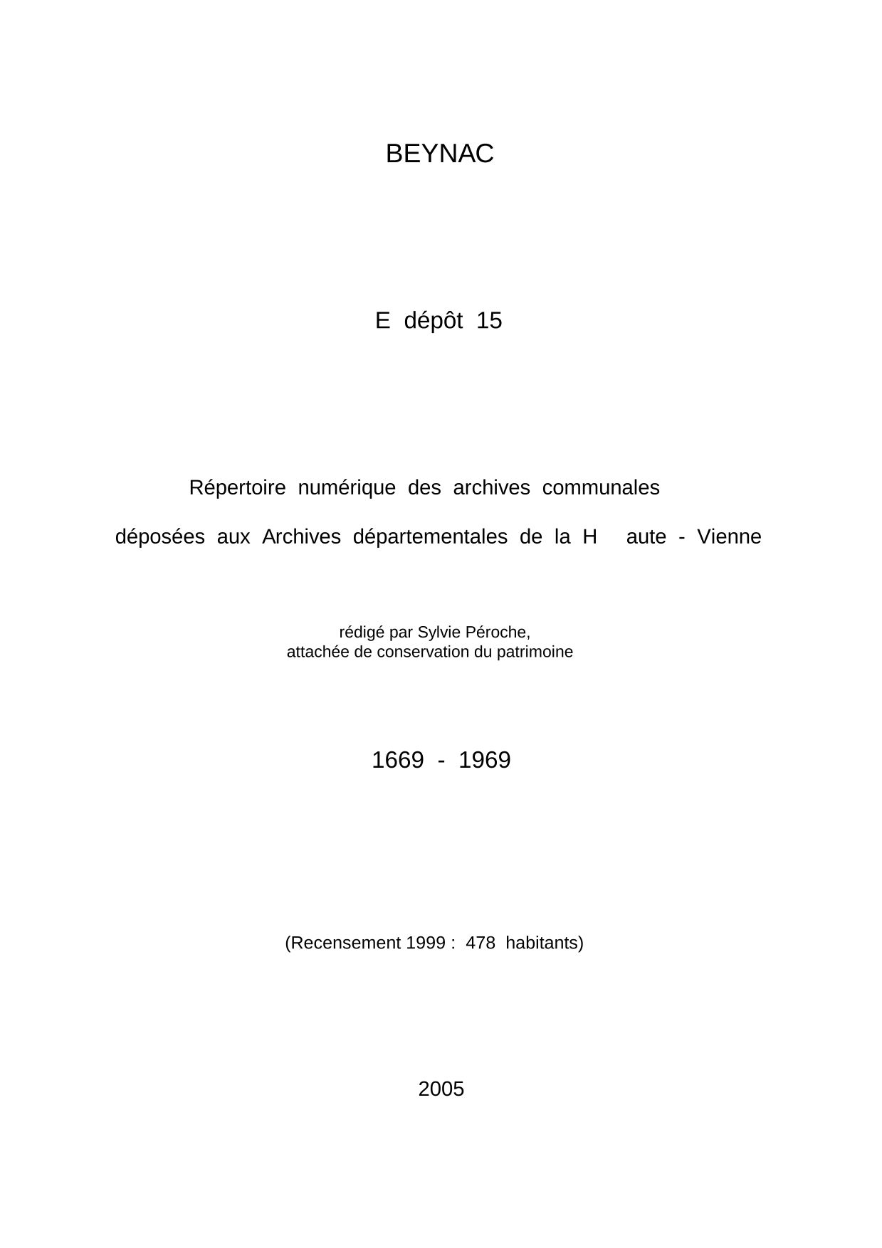 Commune de Beynac. Répertoire numérique des archives communales déposées aux Archives départementales de la Haute-Vienne, par S. Péroche, 2005, 15 p. dact.