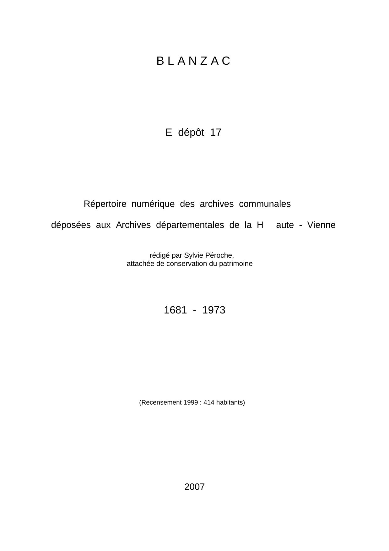 Commune de Blanzac. Répertoire numérique des archives communales déposées aux Archives départementales de la Haute-Vienne, par S. Péroche, 2007, 16 p. dact.