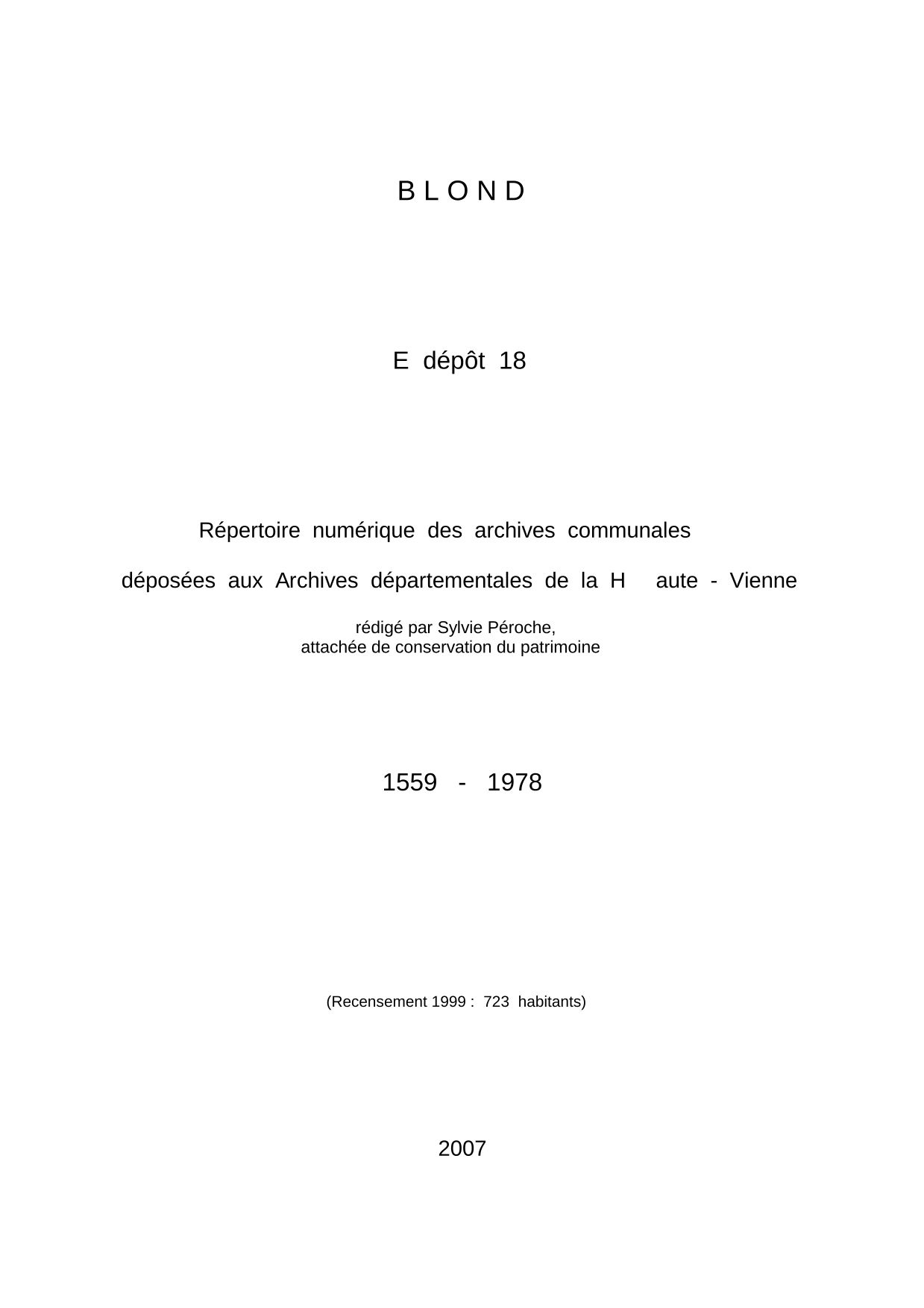 Commune de Blond. Répertoire numérique des archives communales déposées aux Archives départementales de la Haute-Vienne, par S. Péroche, 2007, 30 p. dact.