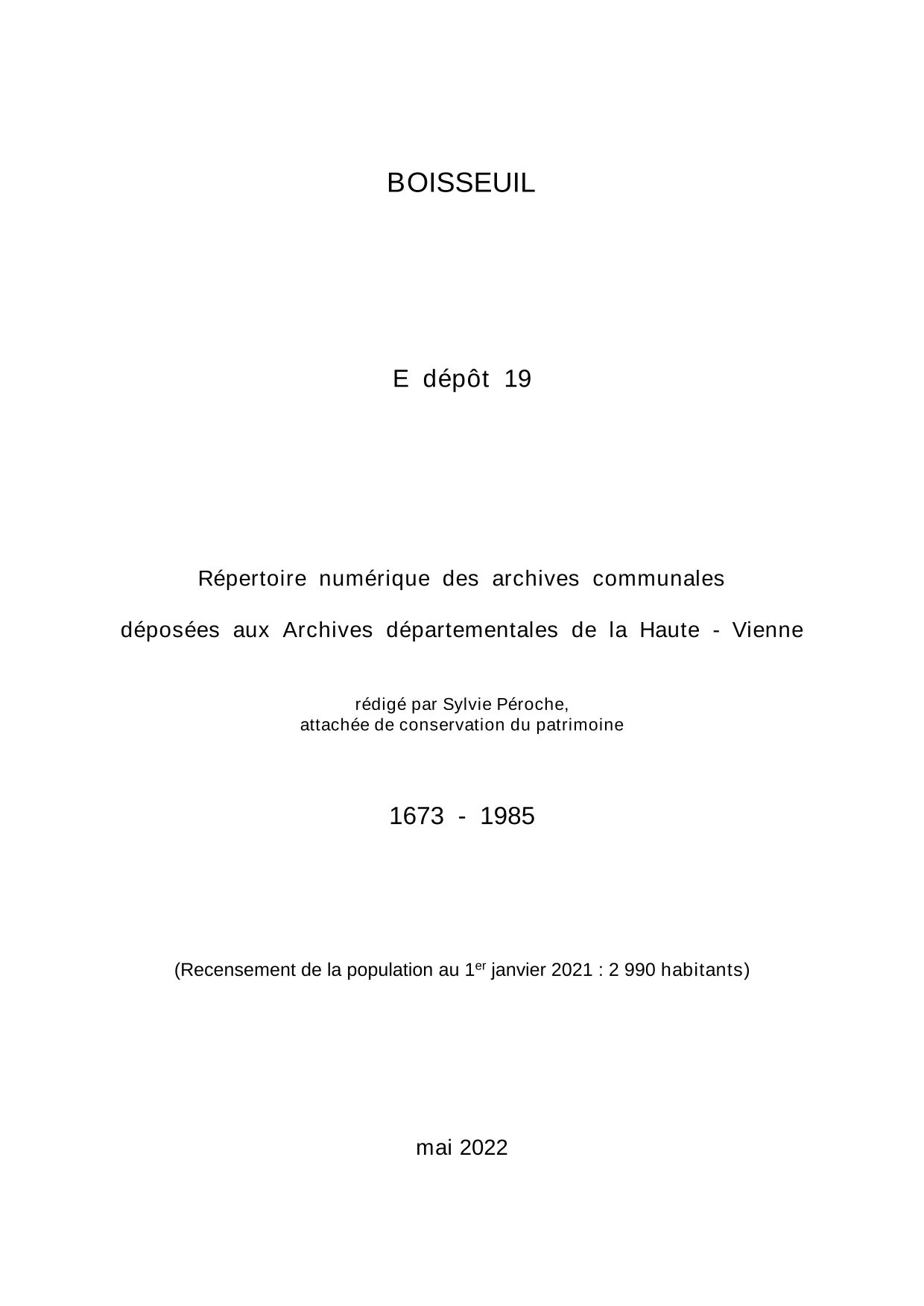 Commune de Boisseuil. Répertoire numérique des archives communales déposées aux Archives départementales de la Haute-Vienne, par S. Péroche, 2022, 24 p. dact.