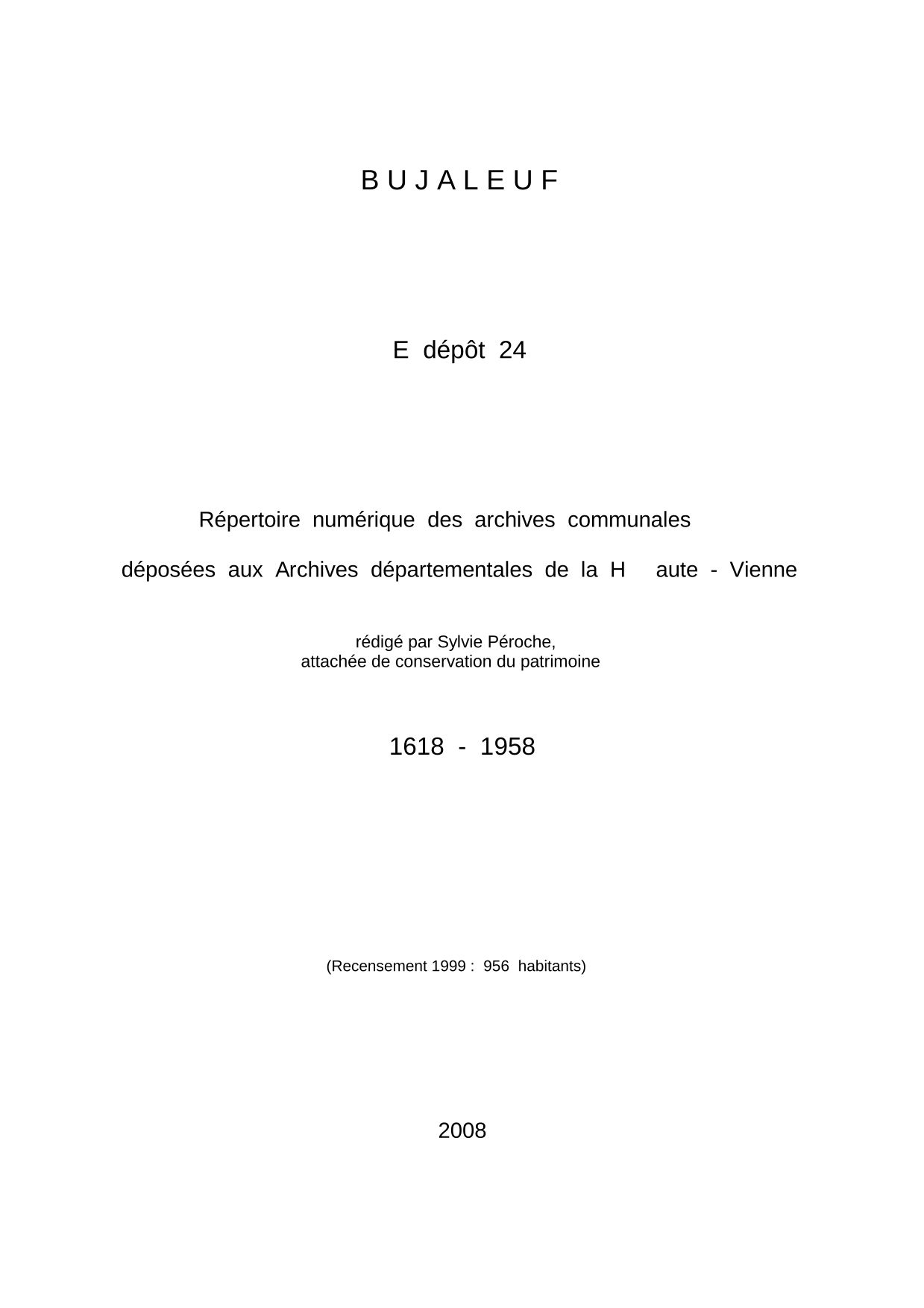 Commune de Bujaleuf. Répertoire numérique des archives communales déposées aux Archives départementales de la Haute-Vienne, par S. Péroche, 2008, 16 p. dact.