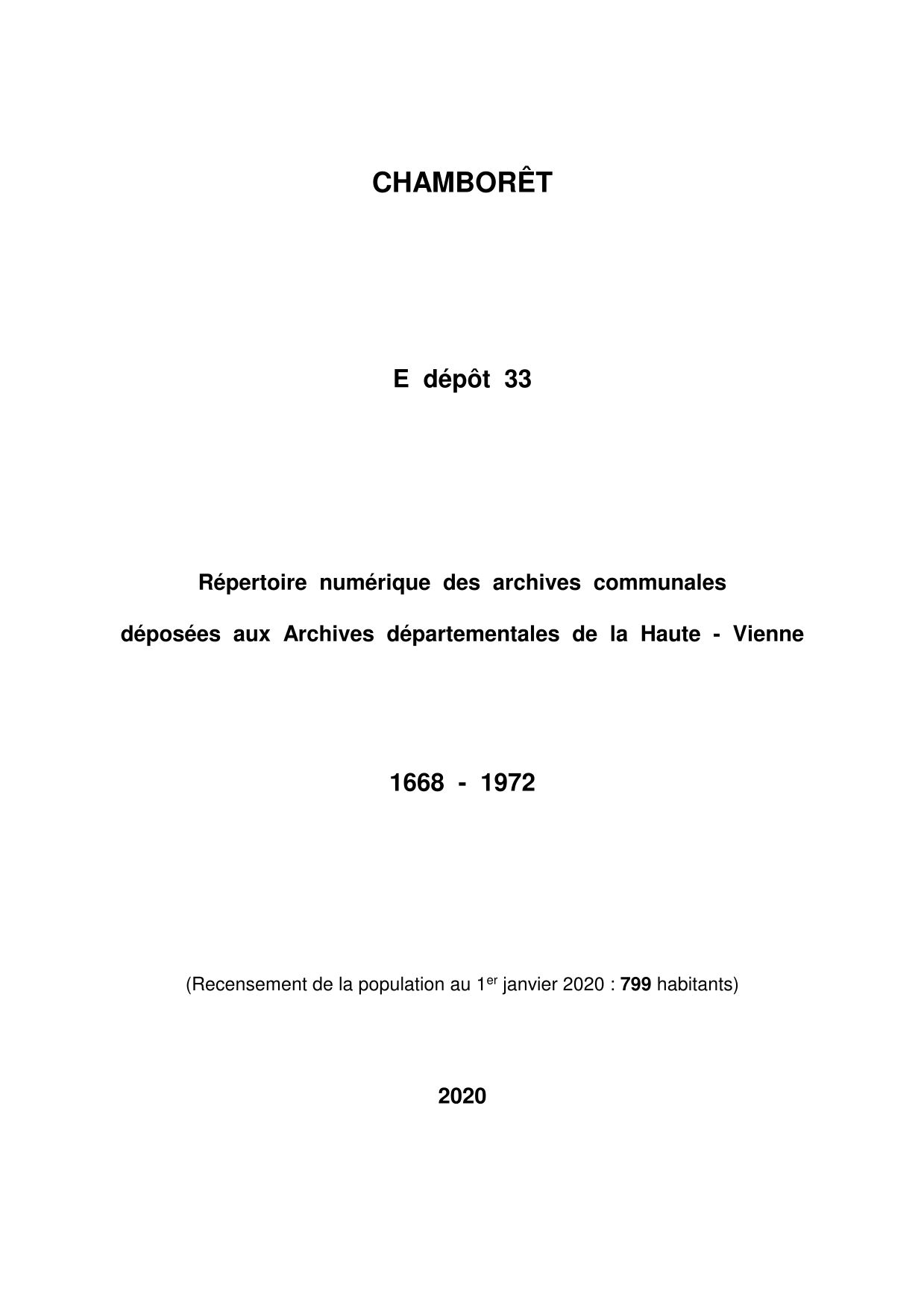 Commune de Chamborêt. Répertoire numérique des archives communales déposées aux Archives départementales de la Haute-Vienne, par S. Péroche, 2020, 17 p. dact.