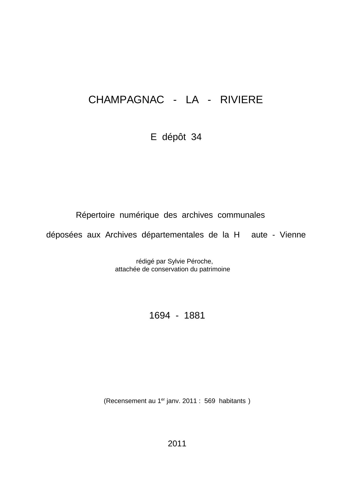Commune de Champagnac-la-Rivière. Répertoire numérique des archives communales déposées aux Archives départementales de la Haute-Vienne, par S. Péroche, 2011, 8 p. dact.