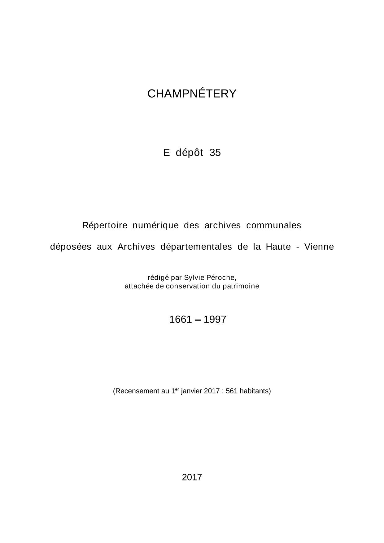 Commune de Champnétery. Répertoire numérique des archives communales déposées aux Archives départementales de la Haute-Vienne, par S. Péroche, 2022, 19 p. dact.