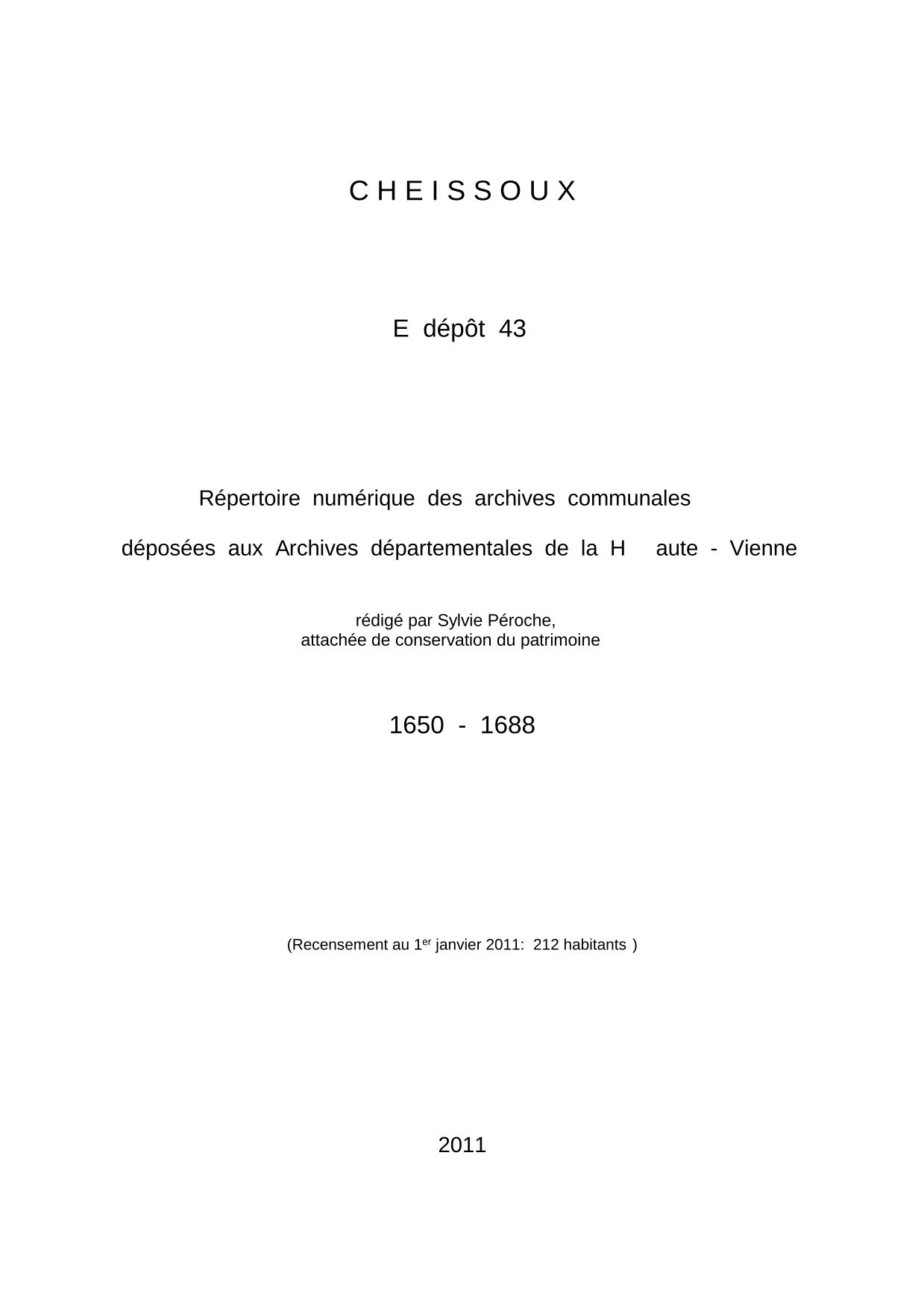 Commune de Cheissoux. Répertoire numérique des archives communales déposées aux Archives départementales de la Haute-Vienne, par S. Péroche, 2011, 4 p. dact.